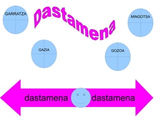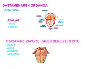 Dastamena 1. 2. 3. FUNTZIONAMENDUAK Dastabotoiek listuan disulbaturiko sustantziak antzemten dituztenean kimoerrezeptoreak estimulatu egiten dira, eta mezua bidaltzen dute garunera. Orduan,zaporea antzematen dugu. 4. 5.