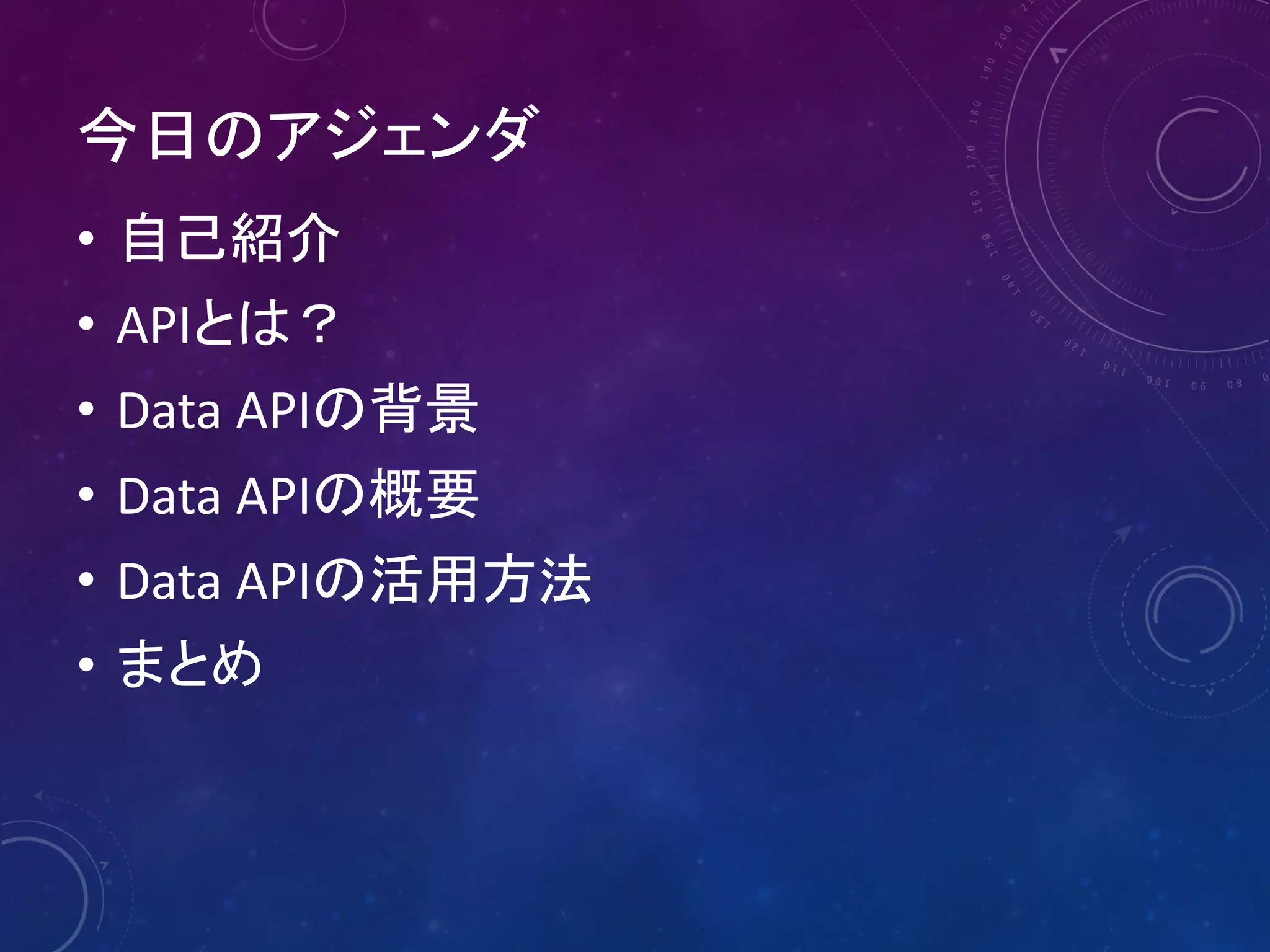 Data APIの背景 • Data APIの概要 • Data APIの活用方法 • まとめ