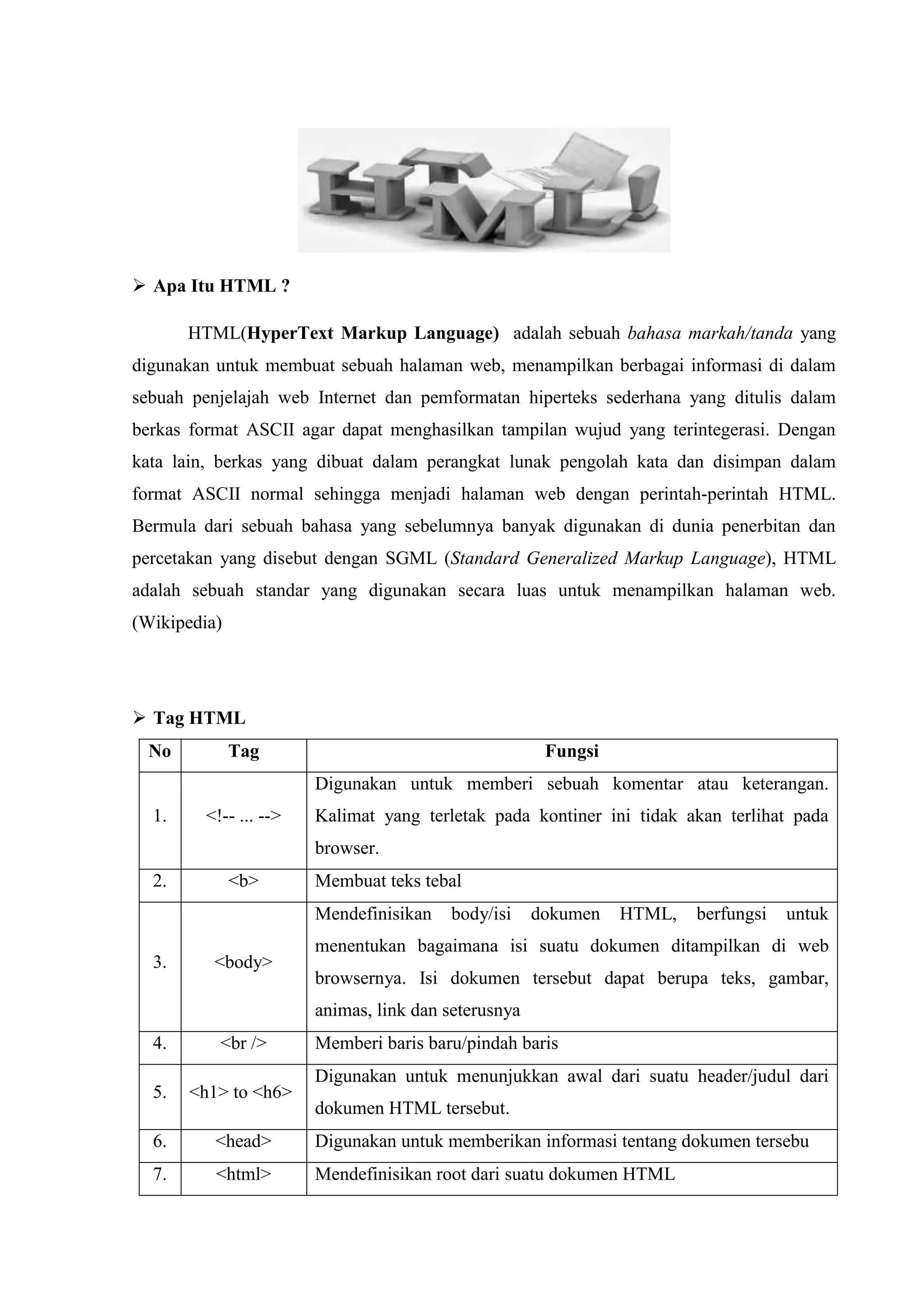 HTML (Hypertext Markup Language) adalah bahasa markah yang digunakan untuk membuat halaman web dan menampilkan informasi dalam browser. Dokumen ini menjelaskan berbagai tag HTML beserta fungsinya, seperti <b> untuk teks tebal dan <img> untuk menampilkan gambar. HTML merupakan standar yang banyak digunakan yang berasal dari SGML untuk keperluan penerbitan dan percetakan.