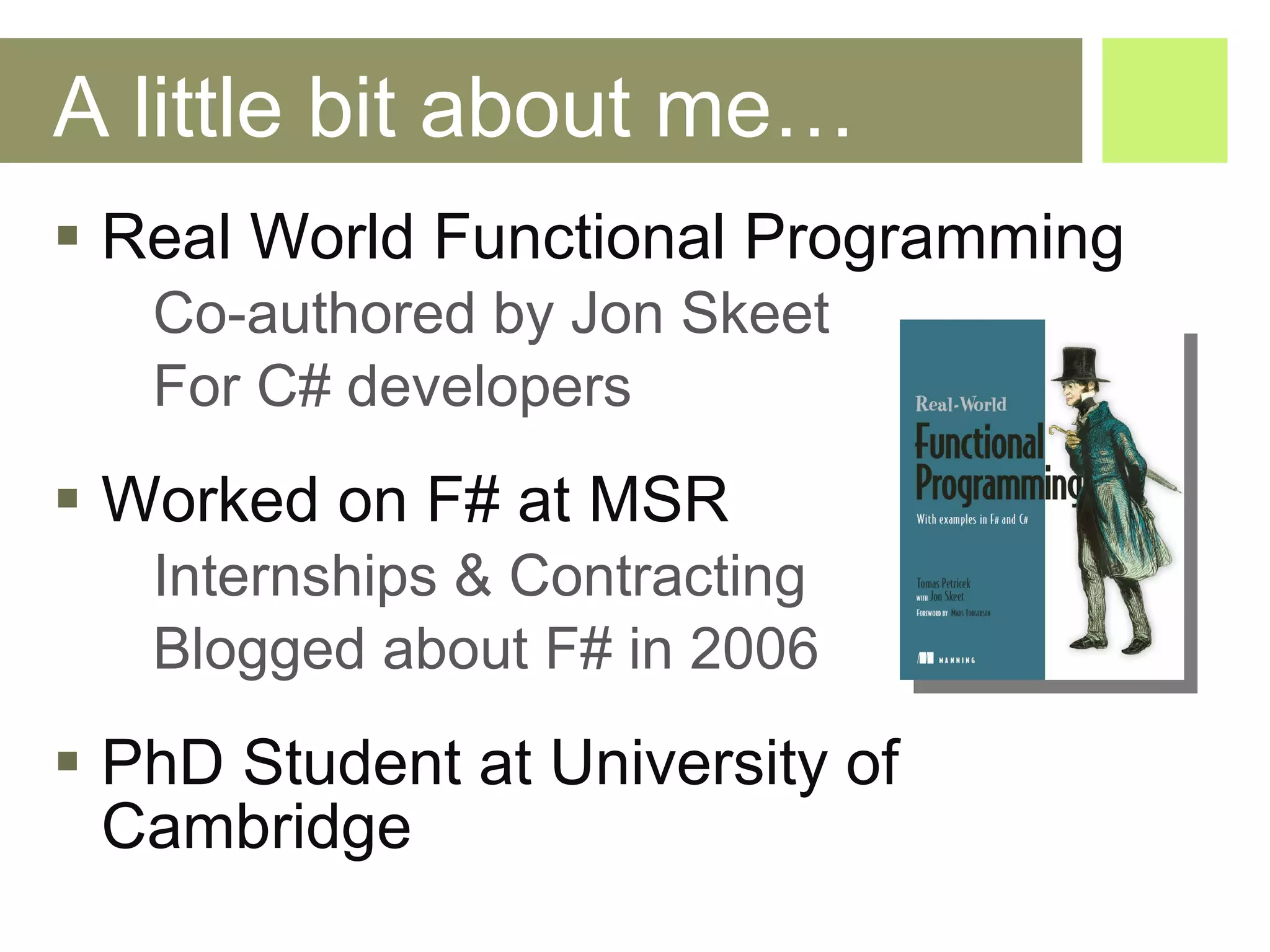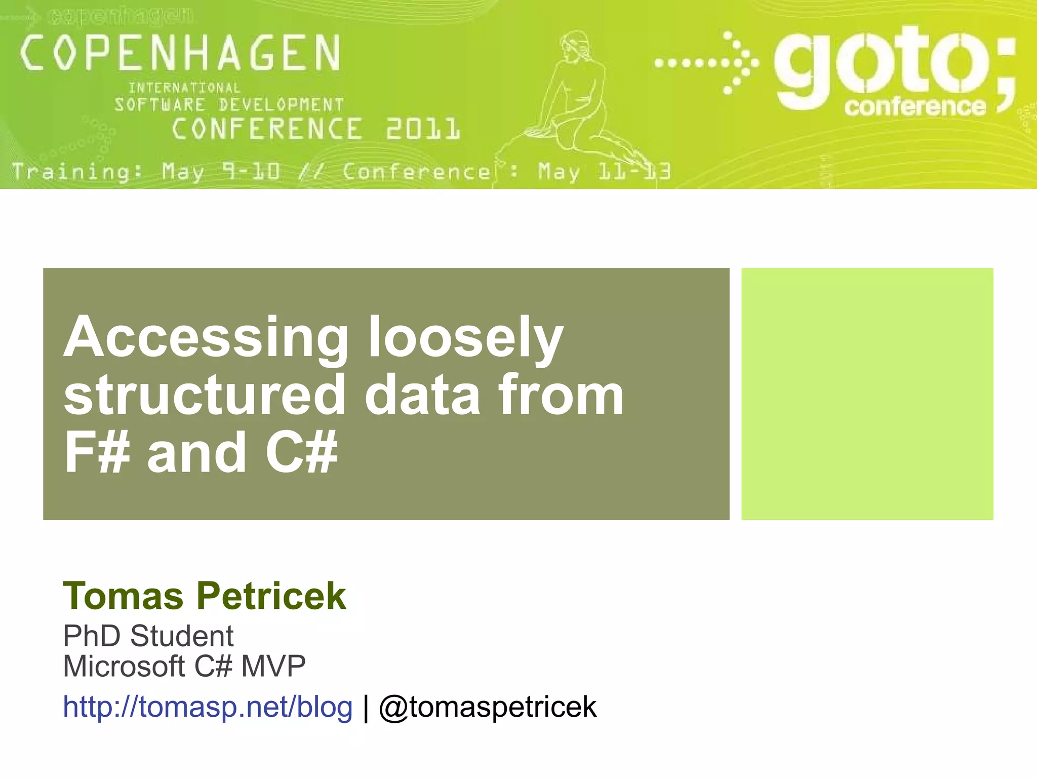 The document discusses accessing loosely structured data from F# and C#, addressing the challenges of structural mismatches in various data sources like databases and XML. It introduces design patterns and dynamic types to handle these issues through type providers that facilitate strong typing and type-safe operations. Additionally, it showcases practical examples and demos of interacting with data using these techniques in both languages.
