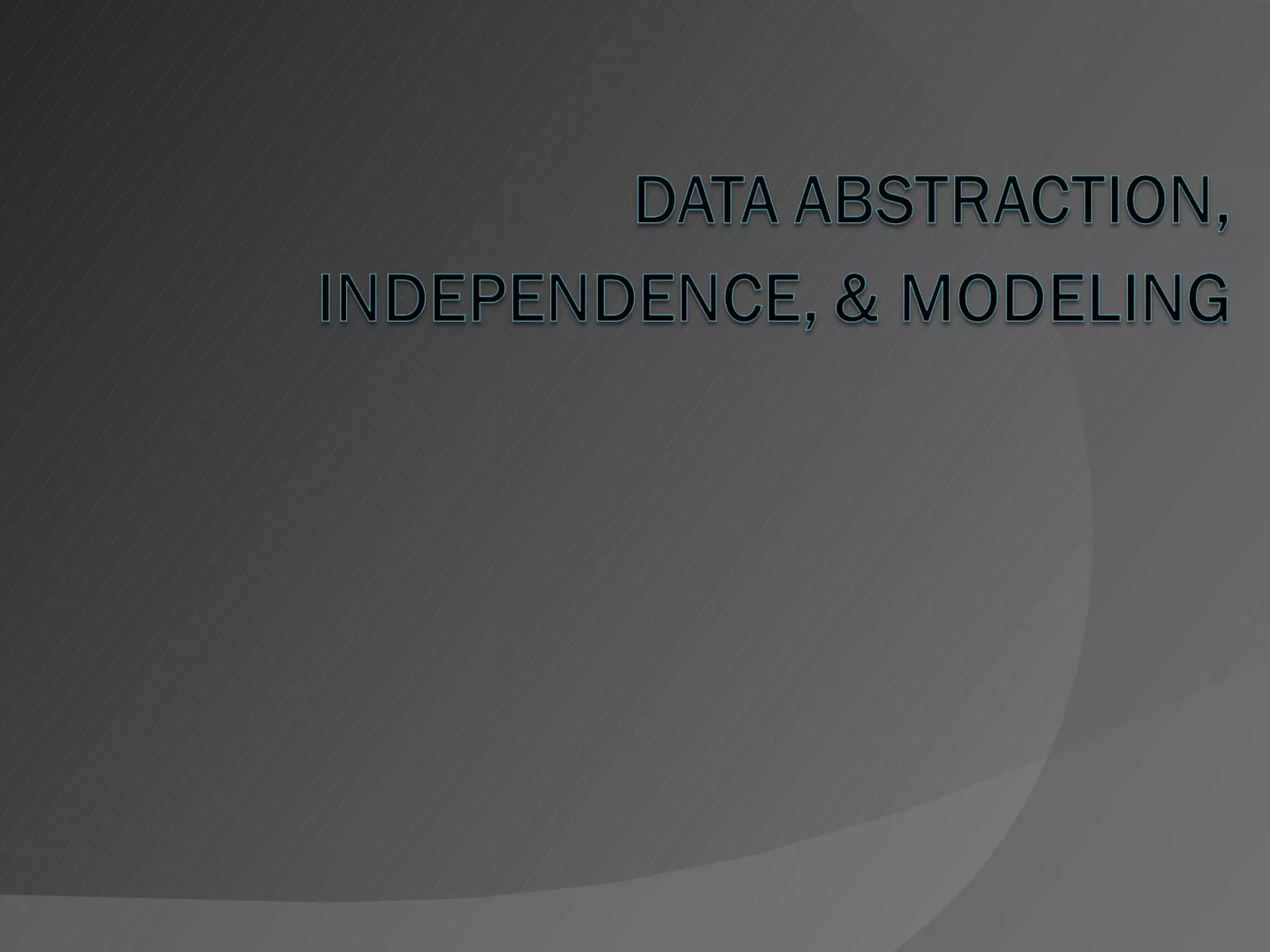 The document discusses data abstraction, data independence, and data modeling in databases. It describes three levels of abstraction (physical, logical, and external), and how a DBMS provides logical and physical data independence. Data modeling uses schemas to define the structure and constraints of data, and popular models include the entity-relationship, relational, hierarchical, and network models.