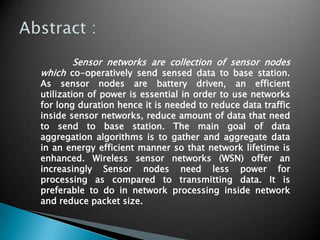 The document discusses data aggregation in wireless sensor networks. It explains that sensor networks aim to gather and aggregate data in an energy efficient manner to extend network lifetime. It describes various data aggregation approaches like centralized, LEACH, and TAG. It also discusses cluster-based and tree-based aggregation where nodes aggregate and transmit data to parent nodes or cluster heads. The document outlines types of queries for sensor networks and benefits of data aggregation in reducing traffic and energy consumption while improving data accuracy.