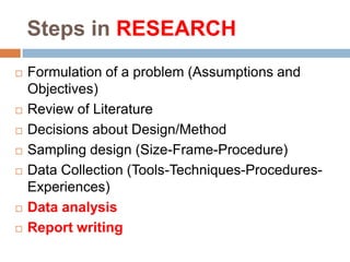 The document outlines the steps involved in conducting research, including problem formulation, data collection, and analysis. It distinguishes between primary and secondary data and emphasizes the importance of clarity and appropriate methodology for obtaining reliable data. Additionally, it discusses the various factors that influence data collection and analysis, illustrating these concepts with examples.