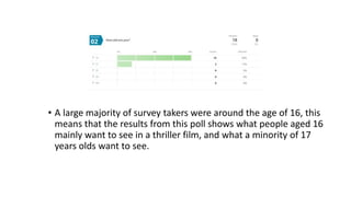 The document summarizes the results of a survey about thriller film preferences among 16-17 year olds. It finds that psychological and crime thrillers were most popular, while horror, sci-fi and dystopian were less so. Most respondents wanted to see a flawed protagonist and setting the film in modern times would be easiest. The survey also informed that characters should be established before story in the opening and fear was the preferred theme.
