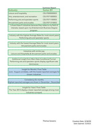 Thomas Scovens created two summary reports analyzing average wage rates across different leisure and entertainment industries from 2010-2019 using industry and month as filters. The reports found that performing arts and spectator sports had the highest average rates for most recent years while amusement parks and arcades had the lowest. June through August consistently had the lowest reported averages across industries. 2013 displayed a lower average among most surveyed industries.