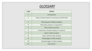 This document provides an overview of data analysis, including definitions, processes, techniques, tools, advantages, and disadvantages. It discusses the importance of data analysis in research, defining key terms like structured vs. unstructured data. The document outlines the data analysis process from data collection and cleaning to interpretation and visualization. It also covers quantitative and qualitative analysis techniques such as regression analysis, hypothesis testing, content analysis, and discourse analysis.