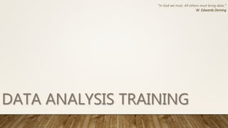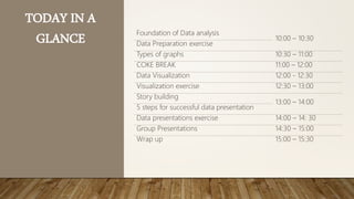 This document provides an overview and agenda for a one-day data analysis training. The training will cover foundational concepts of data analysis including data preparation, visualization, and effective data presentation. It will include exercises in data gathering, graph types, pivot tables, and developing data stories. The goal is to help participants turn data into meaningful insights through analysis and visualization.