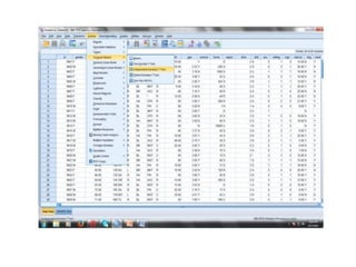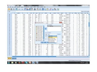 This document provides an overview of key concepts in biostatistics and how to use SPSS software for data analysis. It discusses learning objectives for understanding biostatistics, different types of data (nominal, ordinal, interval, ratio) and variables (independent, dependent