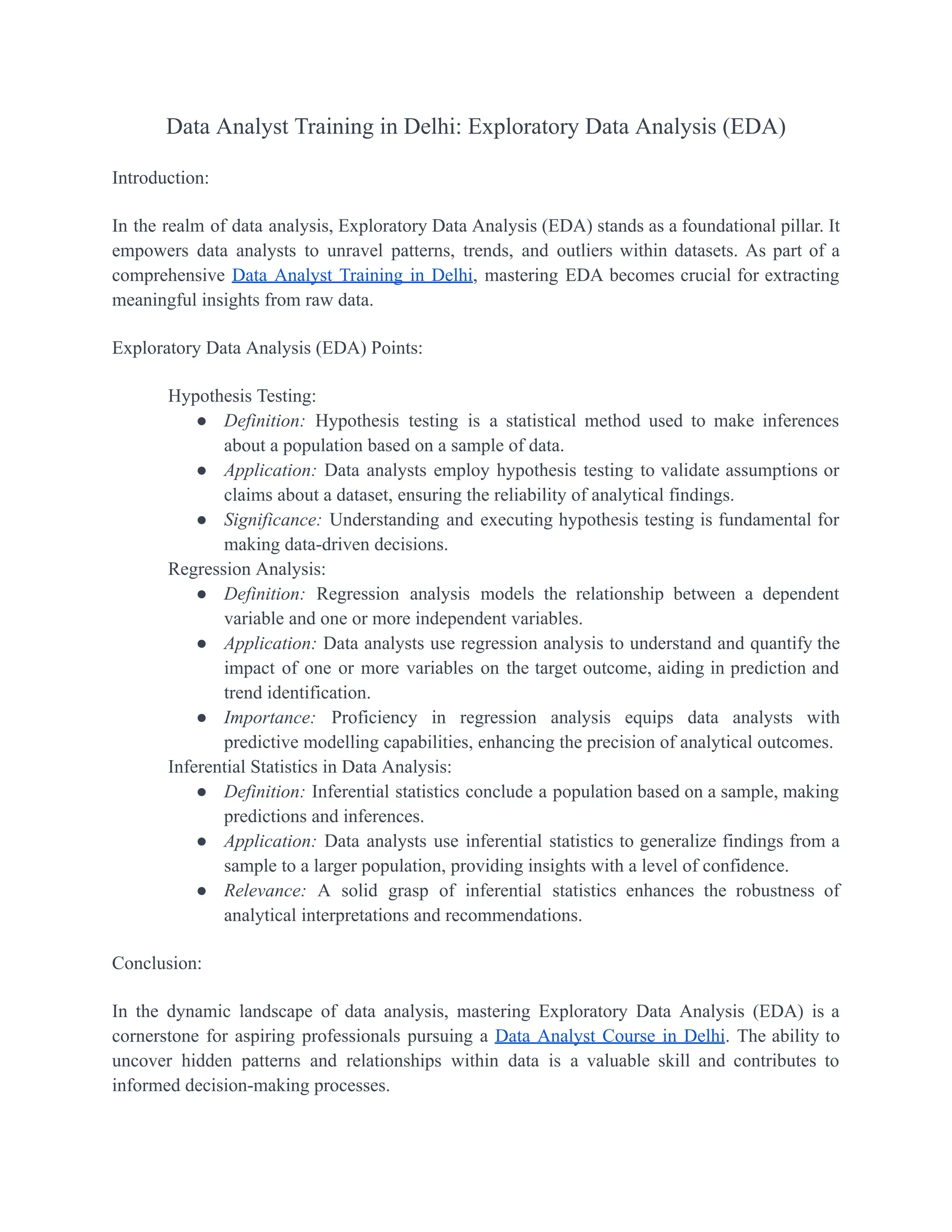 The document discusses the importance of exploratory data analysis (EDA) as a foundational skill in data analyst training in Delhi. It highlights key concepts such as hypothesis testing, regression analysis, and inferential statistics, emphasizing their roles in making data-driven decisions. The conclusion reinforces that mastering EDA is essential for aspiring data analysts to uncover patterns and enhance decision-making.