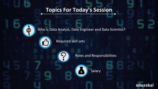 The document outlines the roles and responsibilities of data analysts, data engineers, and data scientists, highlighting their distinct skill sets and salary expectations. A data analyst focuses on data collection and reporting, while a data engineer constructs data processing systems, and a data scientist employs advanced statistical and programming skills. Salary averages are provided, with data analysts earning $58,585, data engineers $90,839, and data scientists $91,470 per year.
