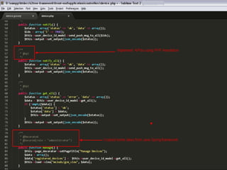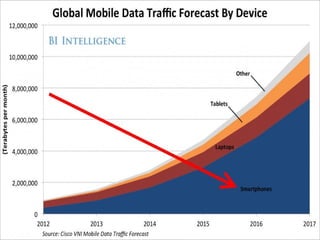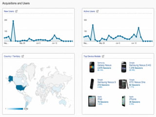 This document discusses using data analytics for mobile app development. It recommends analyzing user behavior and interests through metrics like users, sessions, and events to improve the user experience and inform business decisions. The document provides an example of a mobile advertising app that tracked user taps and social sharing to generate analytics and integrate with Facebook data. It advocates keeping analytics implementations simple while designing architectures that can handle large volumes of data.