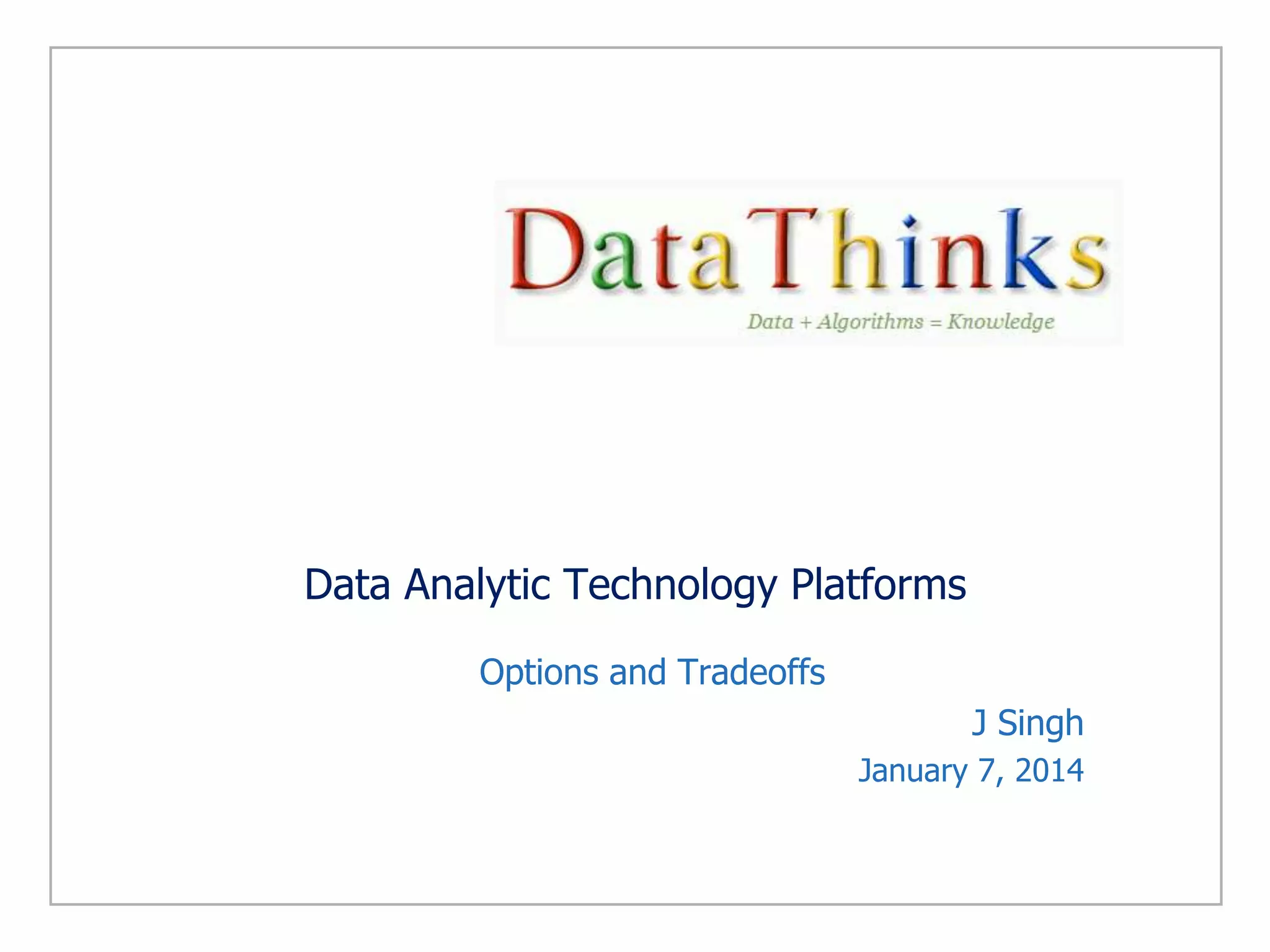 This document discusses options for data analytic technology platforms to address big data problems. It begins by distinguishing between problems that truly involve big data versus just large data problems. Examples of big data problems include recommendations, financial analysis, internet security monitoring, social media network analysis, genomics, and sensor data. The key characteristics of big data problems are that the data sets are too large to download, data is generated rapidly requiring near real-time analysis, and the problems involve diverse data types. The document then outlines the governing principle for choosing a platform as processing needing to be close to the data due to data size. Examples of platforms used for different applications are discussed to illustrate this principle. The decision making process for choosing a platform is described as