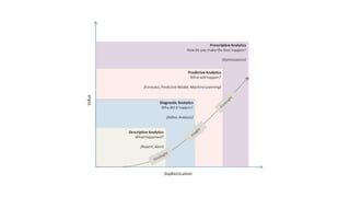 The document discusses data analytics and its evolution from relying on past experiences to using data-driven insights. It covers the types of analytics including descriptive, diagnostic, predictive, and prescriptive analytics. Descriptive analytics summarize past data, diagnostic analytics determine factors influencing outcomes, predictive analytics make future predictions, and prescriptive analytics identify best courses of action. The document also discusses data analysis tools, natural language processing, applications of analytics, benefits of analytics for IoT, and issues with big data in IoT contexts like smart agriculture.
