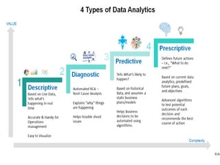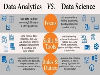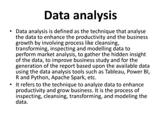 Data analysis involves inspecting, cleansing, transforming, and modeling data to draw conclusions and make predictions that inform decision-making. It includes gathering hidden insights from data, generating reports, and performing market analysis to improve business strategies. Data analytics builds on data analysis by including additional processes like data science and engineering. It allows businesses to gain hidden patterns from customer behavior for more informed decisions, effective marketing, efficient operations, and cost cutting.