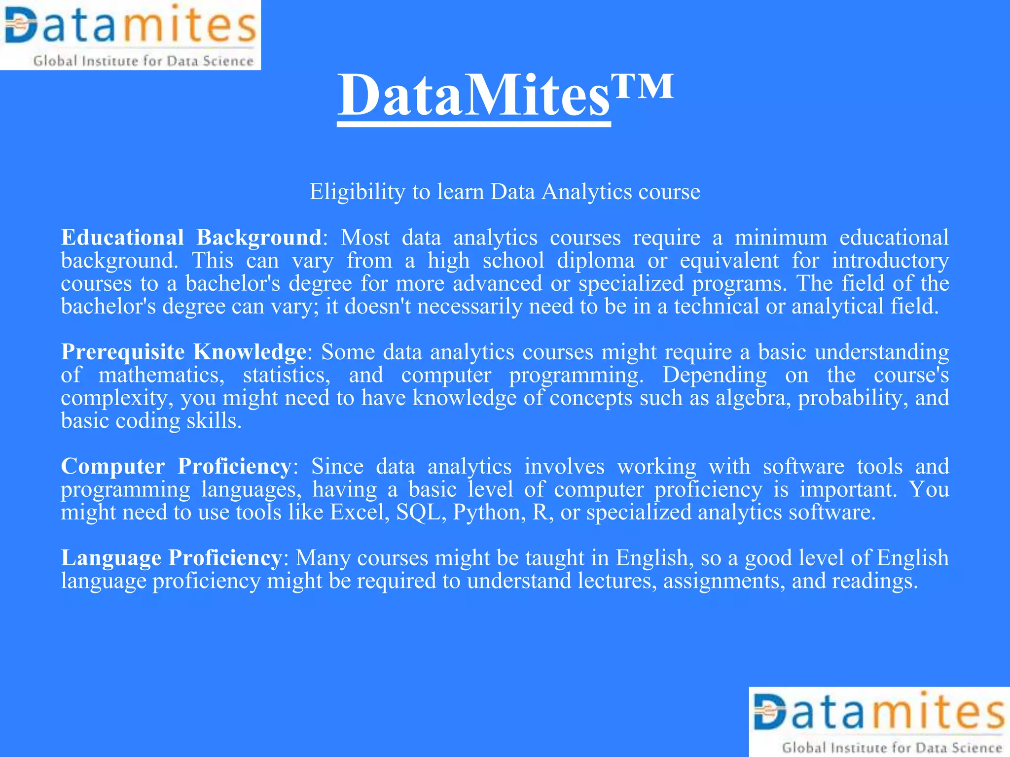 Datamitestm offers a data analytics course in Mumbai with upcoming batches starting on August 19 (online) and August 21 (classroom). The course requires a basic understanding of mathematics, statistics, and computer programming, along with proficiency in tools like Excel, SQL, Python, and R. It prepares students for careers in various roles such as business analyst, market analyst, financial analyst, and healthcare data analyst, and includes project work and IABAC certification.