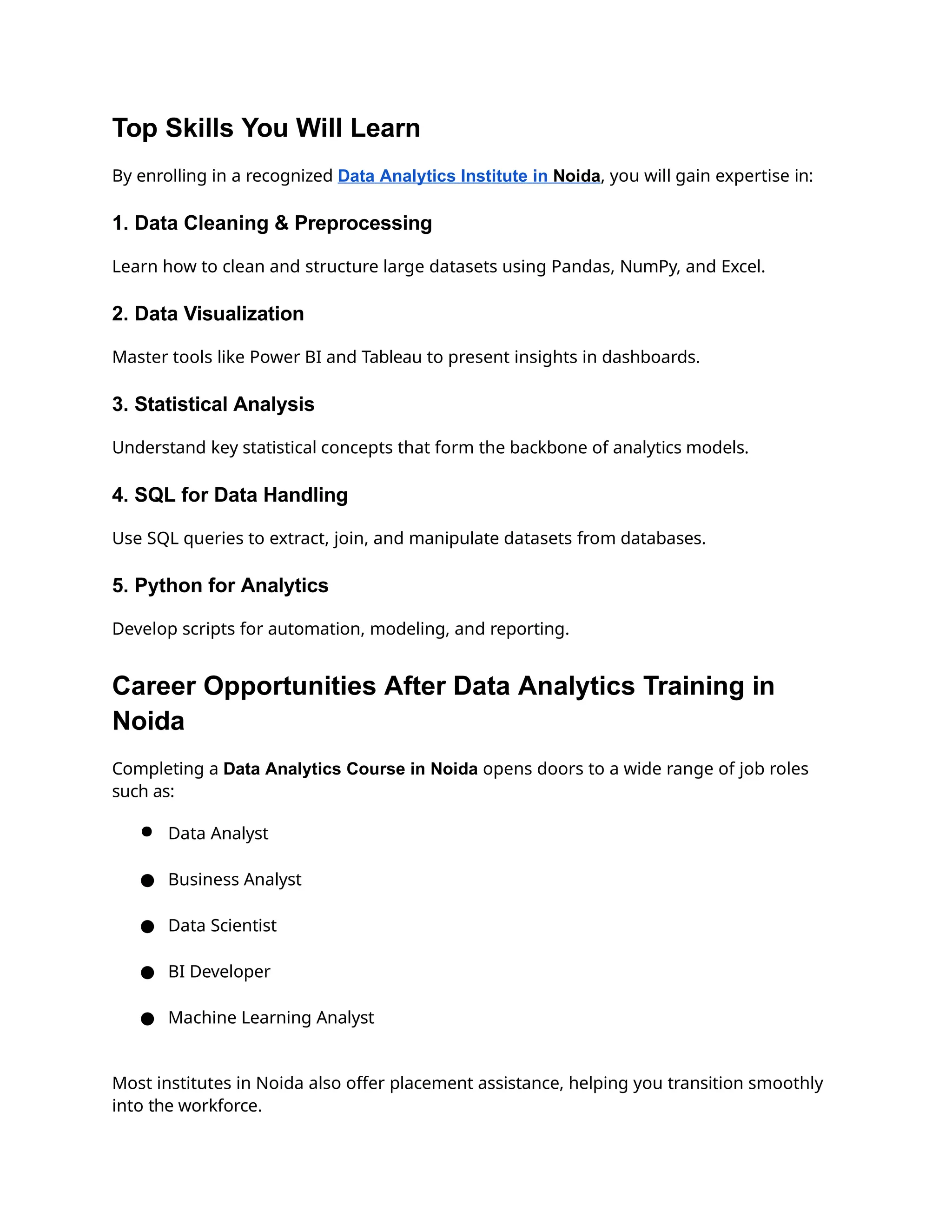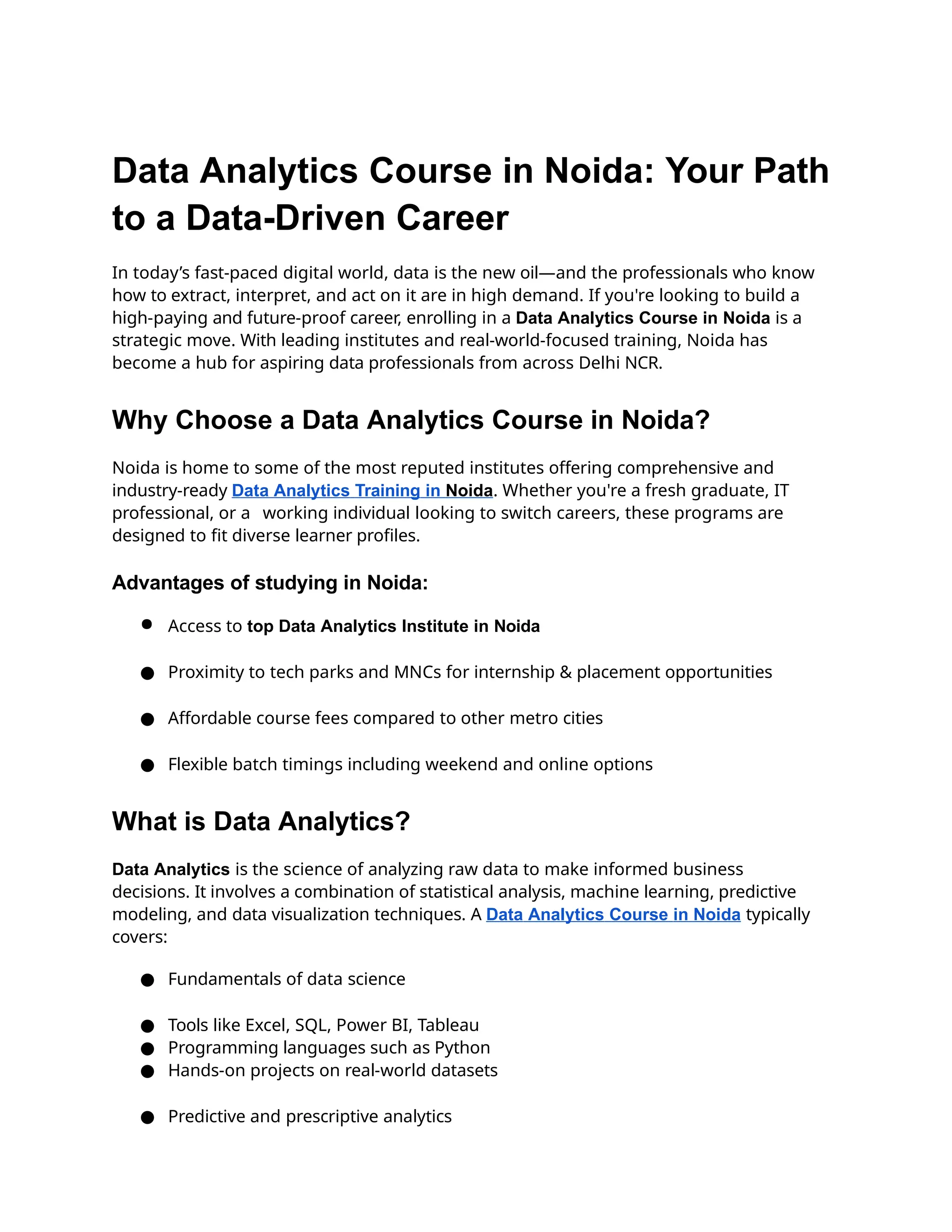 In today’s fast-paced digital world, data is the new oil—and the professionals who know how to extract, interpret, and act on it are in high demand. If you're looking to build a high-paying and future-proof career, enrolling in a Data Analytics Course in Noida is a strategic move. With leading institutes and real-world-focused training, Noida has become a hub for aspiring data professionals from across Delhi NCR.