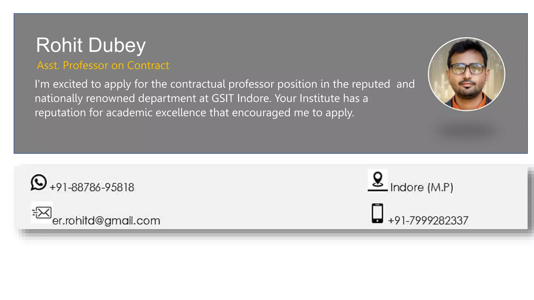Rohit Dubey, an assistant professor applying for a contract position at GSIT Indore, highlights his strong educational background and teaching experience in data analytics and programming. He discusses various types of data analysis and emphasizes its importance in business decision-making. Dubey expresses enthusiasm for contributing to the institution's academic excellence.