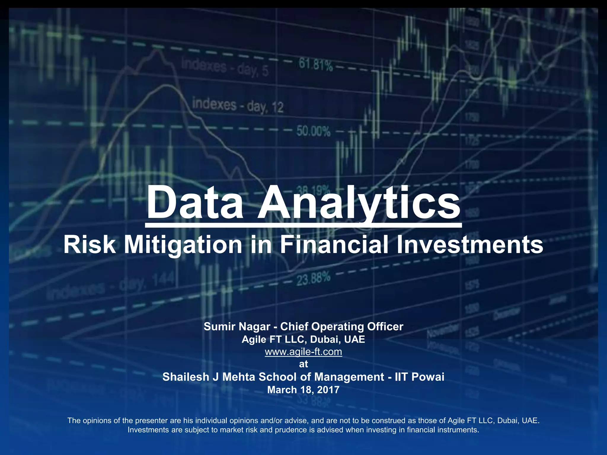 - The document discusses risk mitigation in financial investments through the use of data analytics. It covers assessing different investor types and their varying objectives, analyzing different asset classes and their risks, and using analytical tools like technical analysis and fundamental analysis to develop investment strategies and manage portfolio risk. The focus is on collecting and analyzing relevant data from multiple sources to predict market movements and make informed investment decisions.