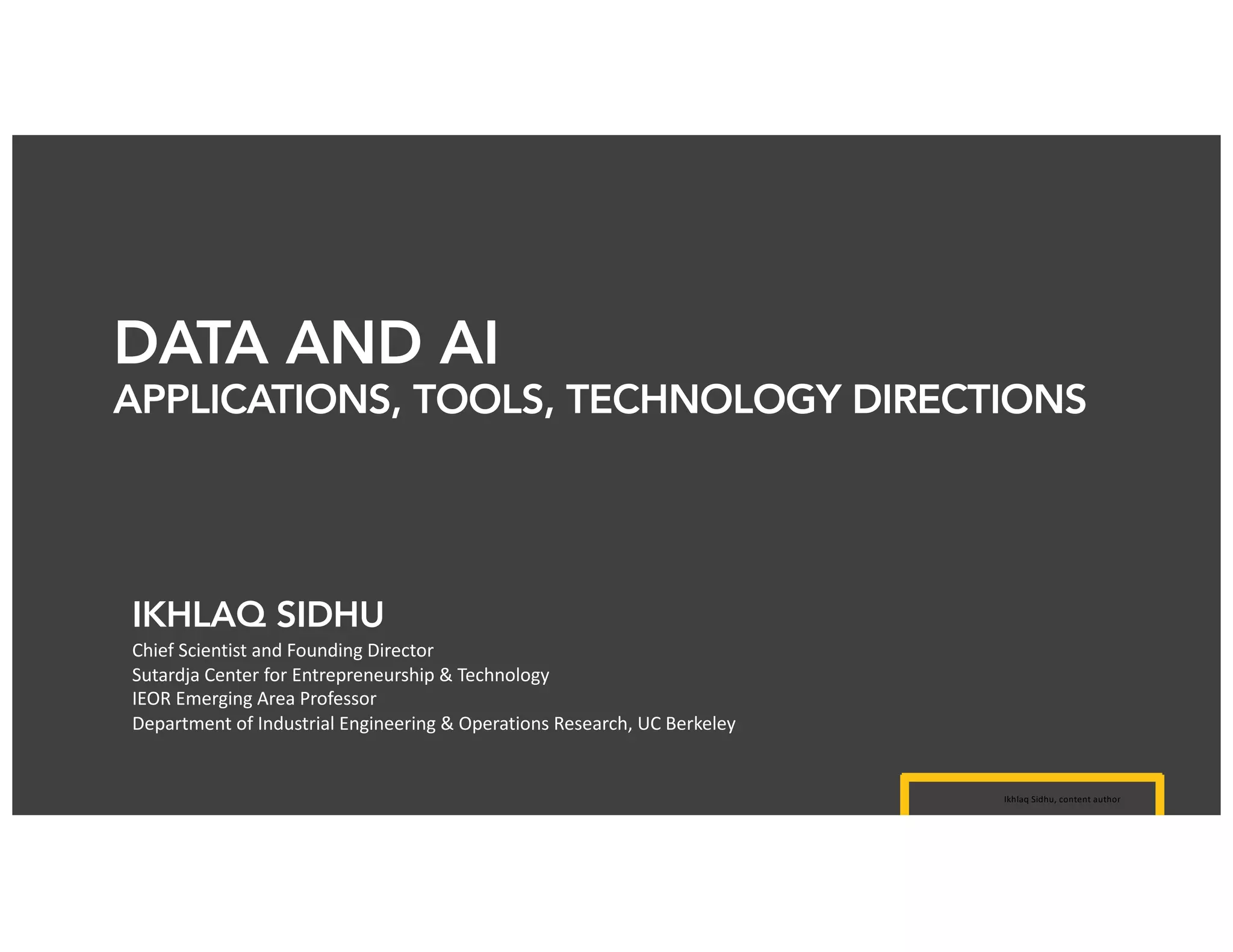 Ikhlaq Sidhu is the Chief Scientist and Founding Director of the Sutardja Center for Entrepreneurship & Technology at UC Berkeley. The document discusses the Sutardja Center's focus on data and AI applications, tools, and emerging directions. It provides an overview of the Center's undergraduate and graduate programs, global partnerships, and applied research labs including the Data-X Lab. Examples of student projects utilizing data and AI are presented. Emerging areas of focus like deep learning, robotics, and collaborative human-machine systems are also discussed.