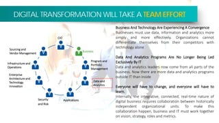 In 2017, Sameer Dhanrajani outlined a vision for data and analytics leadership emphasizing the collaboration between business and IT to drive digital transformation. The need for new talent and leadership, particularly the role of the Chief Data Officer, was highlighted as organizations must evolve to manage the growing complexity of data. Successful data-driven initiatives require a shift in mindset and a cohesive strategy across all levels of the organization.