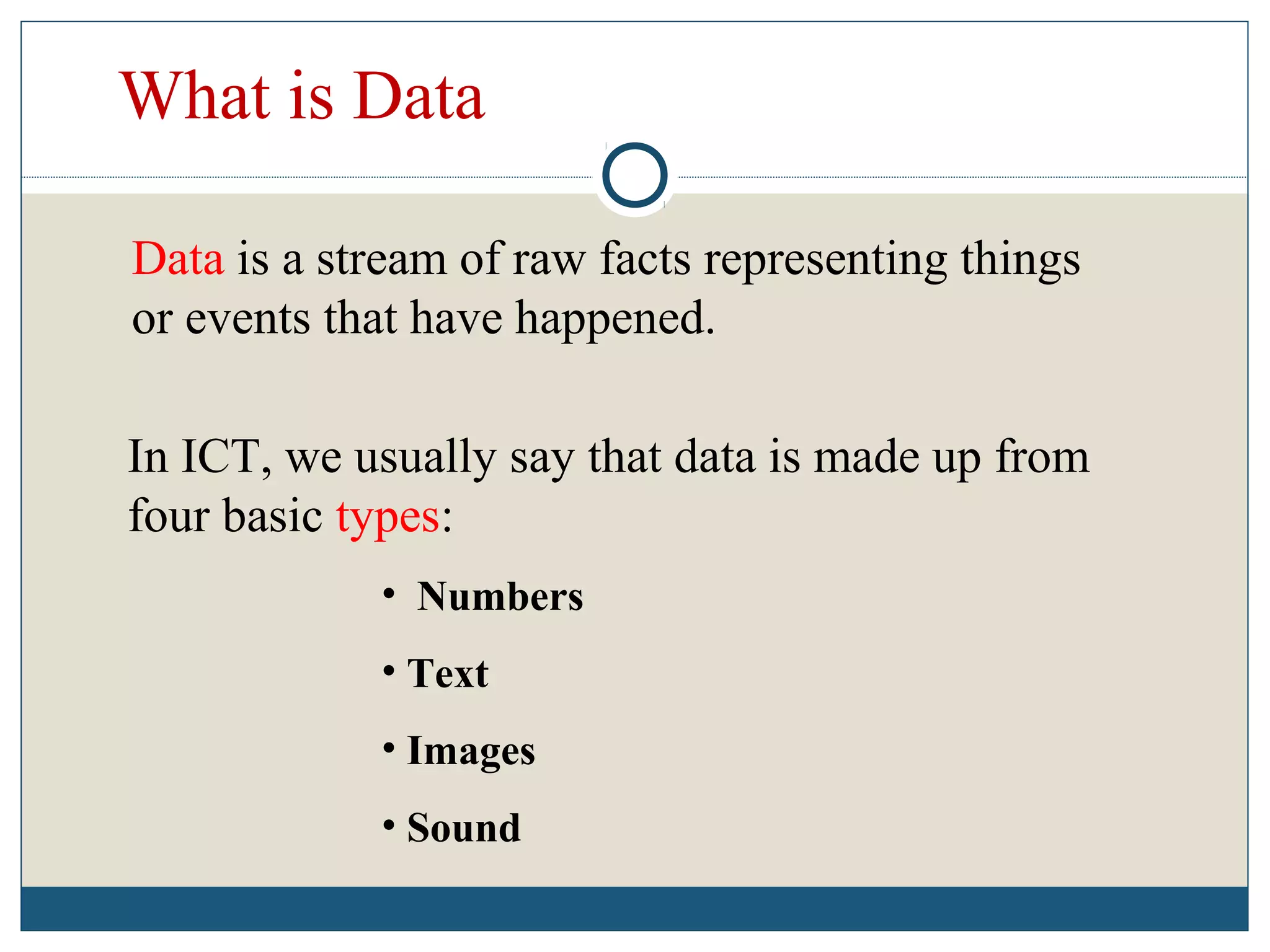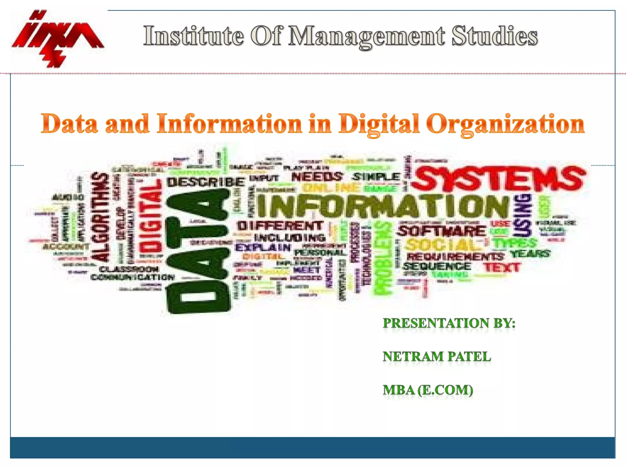 Data refers to raw facts that are stored in computers as numbers, text, images, or sound. All data types are converted to binary digits (bits) for storage and later reconstructed. Text is stored through ASCII codes, images use pixels mapped to bit patterns, and sound is represented by discrete samples encoded as bits. Information involves processing and organizing data to make it meaningful. Databases centrally store structured data that can be retrieved, added to, modified, or deleted when needed. Digital information systems encompass the hardware, software, networks, people, and processes used to collect, manipulate, store, and transform data into useful information for businesses and their management.