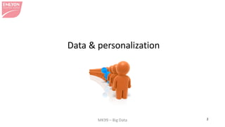 This document outlines lecture slides from a course on big data and personalization. It discusses how segmentation of large datasets can be used to personalize services down to the individual level, and how sensors and wearable devices are generating more bodily data that can be used for personalization. It also addresses the limitations of algorithmically curated personalization, such as reduced serendipity, autonomy, and sense of community, and how some companies like Zappos are able to offer personalized customer service without relying entirely on customer data.