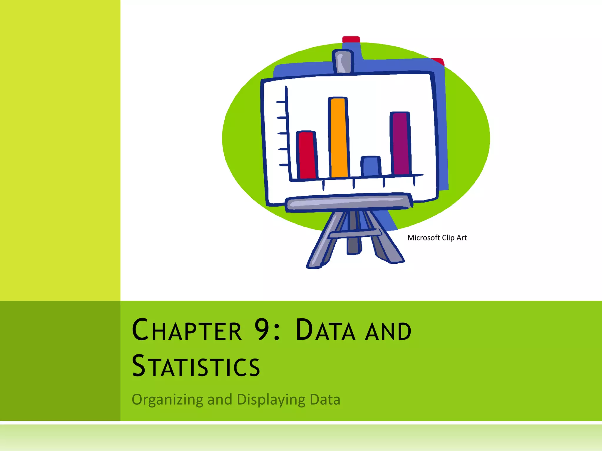 This document discusses various methods for organizing and displaying data, including line plots, stem-and-leaf plots, Venn diagrams, measures of central tendency, box and whisker plots, histograms, scatter plots, and double bar graphs and line graphs. It provides examples and explanations of each method. Key requirements for graphs like titles and labels are also covered.