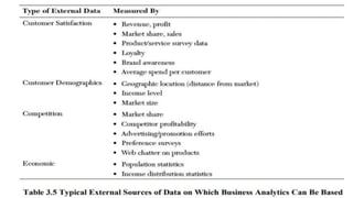 The document outlines the significance of data and technology in business analytics, emphasizing the importance of both structured and unstructured data sources, categorized into internal and external types. It discusses critical data issues such as quality and privacy, the role of database management systems (DBMS) for efficient data management, and the use of advanced analytical tools for data processing and decision-making. Furthermore, it highlights the necessity of a robust information technology infrastructure to support business analytics processes, underscoring that substantial technological investment is essential for firms aiming to leverage analytics for competitive advantage.