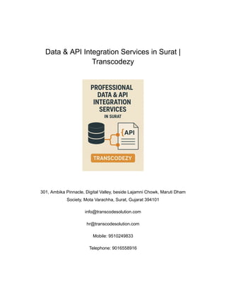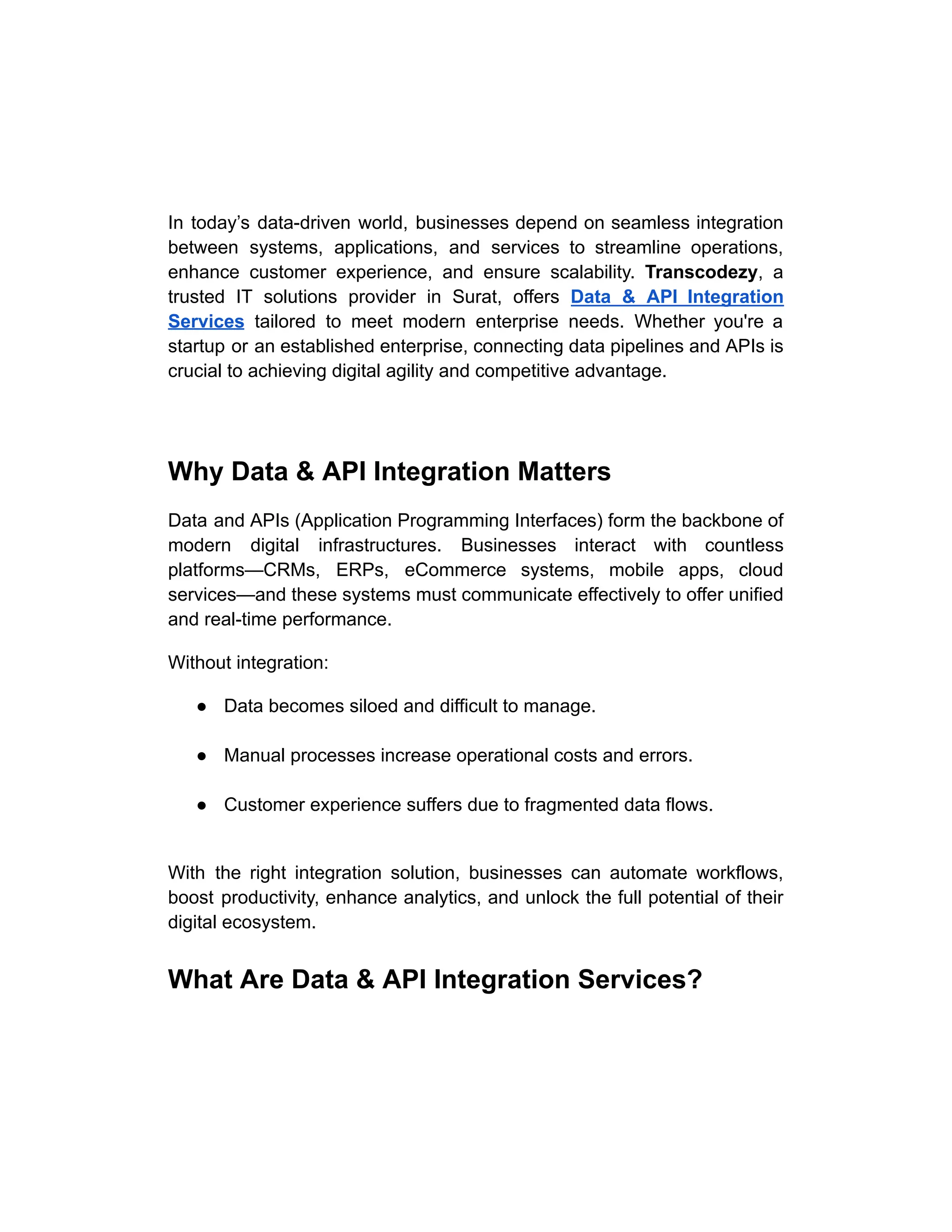 The demand for unified, real-time, and intelligent business operations is only growing. With the rise of IoT, AI, and big data, having a reliable integration partner is essential. Transcodezy’s Data & API Integration Services in Surat position your business to scale faster, operate smarter, and innovate confidently.