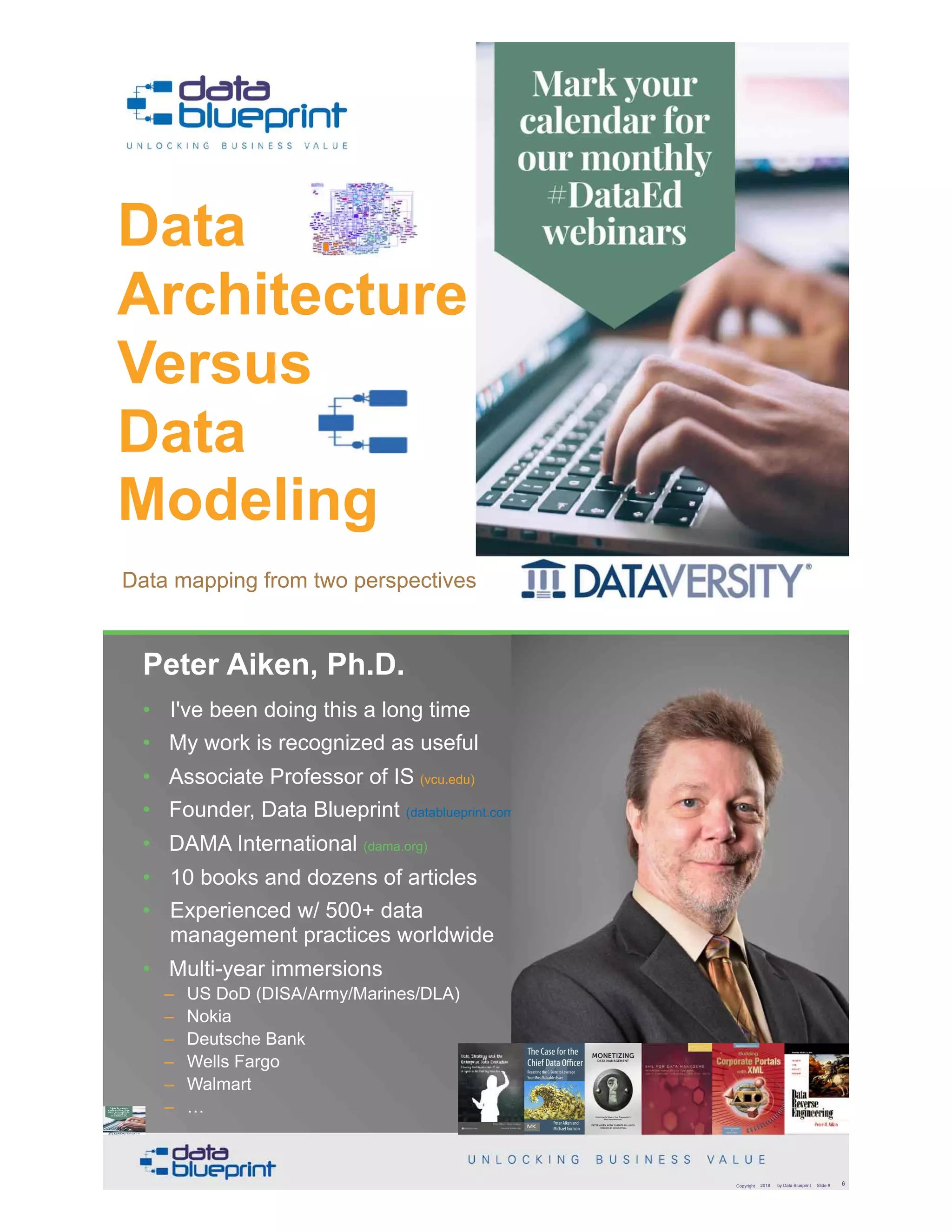 The document discusses the importance of data architecture and data modeling, emphasizing that both are essential for effective data management. It outlines the different types of architectures and the need for data maps and purpose statements to fully leverage data assets. The author advocates for a structured approach to data management, highlighting that poorly managed data can significantly increase operational costs and hinder organizational effectiveness.