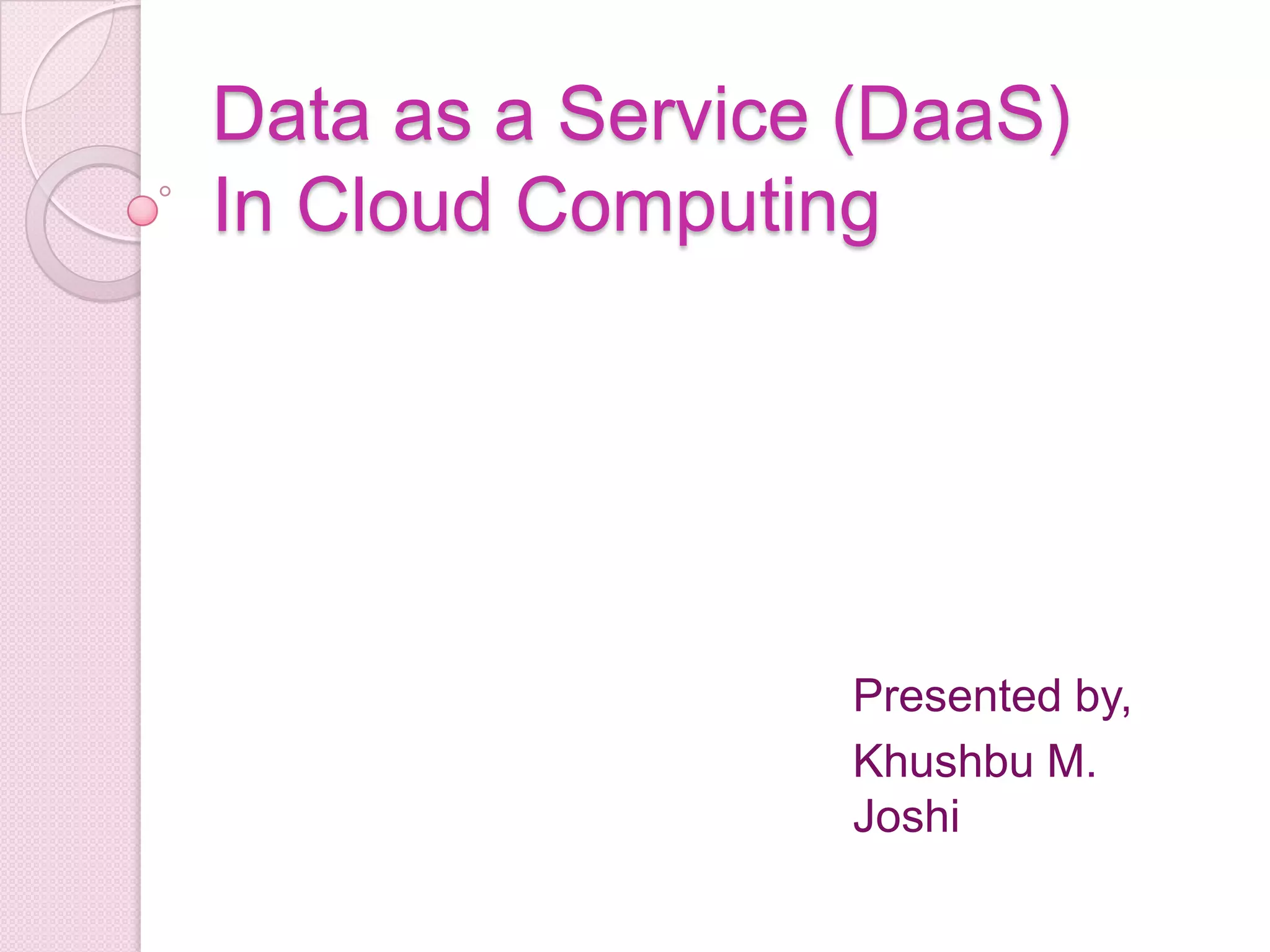 This document discusses Data as a Service (DaaS) in cloud computing. It defines DaaS and explains that it allows users to access data stored in the cloud from any location. The document outlines the components, architecture, pricing models, benefits and drawbacks of DaaS. It provides examples of companies that offer DaaS like Google, Windows Azure, and Amazon.