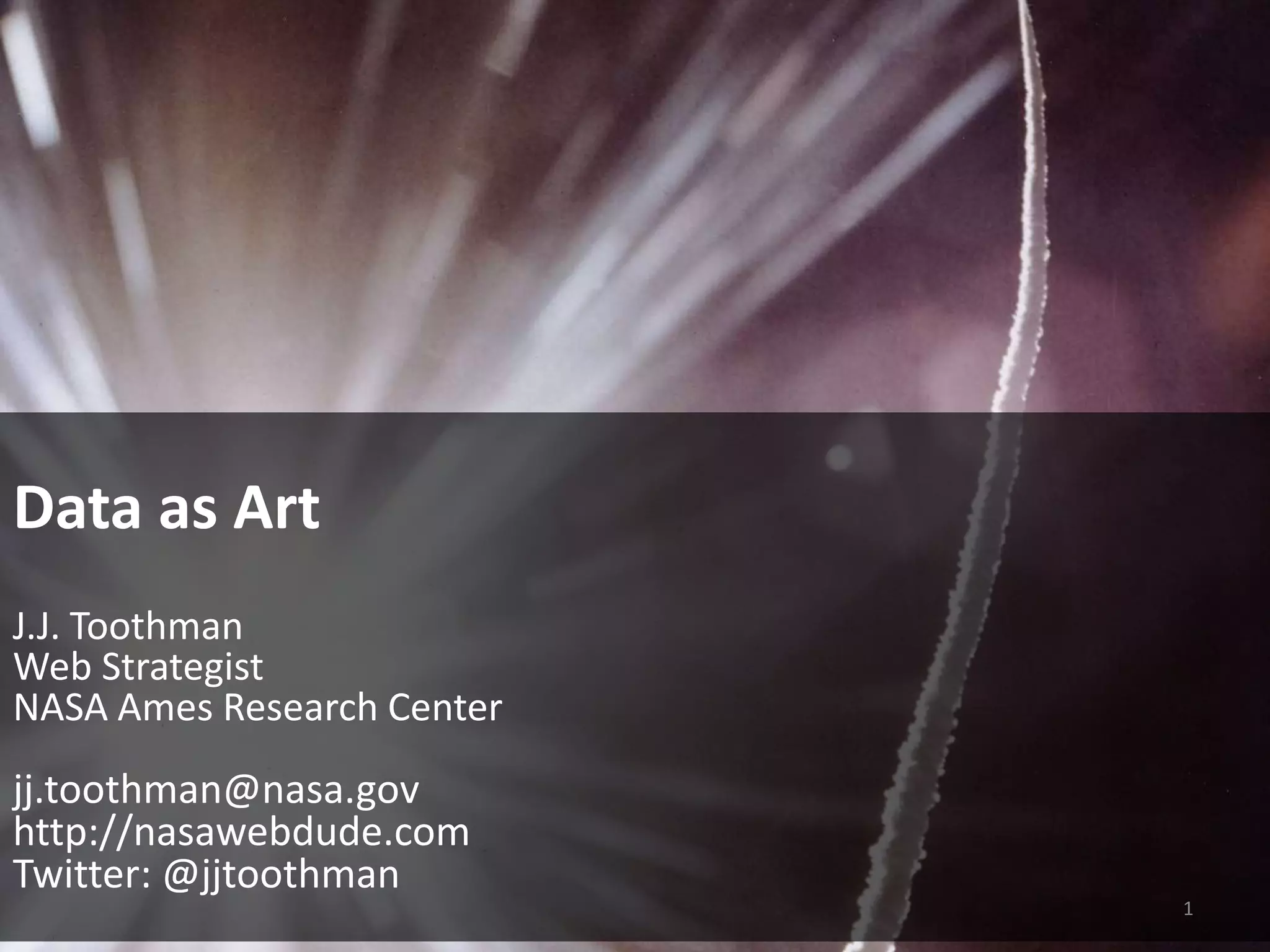 This document discusses data as art and provides examples of artistic visualizations that tell stories with data. It begins with an introduction of the presenter and an overview of using data to create art. Examples shown include visualizations of Napoleon's march to Moscow in 1861, Flickr tag mapping from 2008, flight patterns from 2007, and recordings of daily activities in Boston from 2009. The goal of data art is to use vast amounts of information in creative ways to influence the senses, emotions, and intellect.