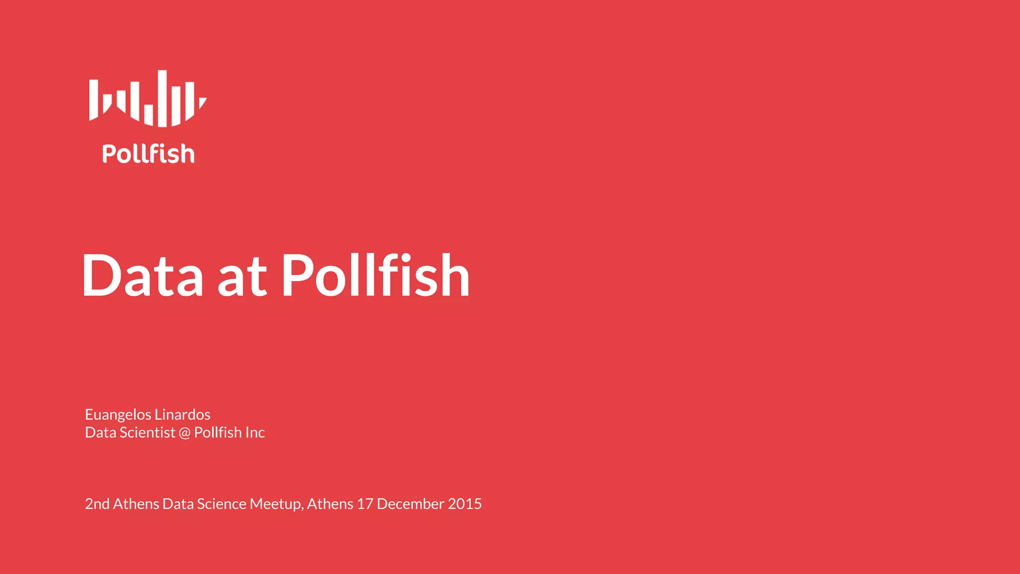 This document summarizes a presentation about Pollfish, a mobile survey platform. It discusses how Pollfish collects data from over 170 million mobile devices worldwide through surveys and device/user information. It handles big data by storing raw data in HDFS and using Cassandra for time-series and user profile data while PostgreSQL stores aggregated data. Spark is used for general cluster computing. Machine learning models use survey data to classify users into personas to personalize surveys. The system architecture includes HDFS, Cassandra, PostgreSQL, Azkaban for workflows, and Spark.