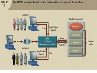 This document provides an introduction to database systems for a BS in IT degree. It discusses key concepts like the difference between data and information, the historical roots of databases in file systems, database management systems and their functions, different database models including hierarchical, network and relational models, and the evolution of database models over time. It also defines important terms and describes the roles of different users in a database system environment.