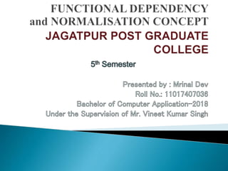 This document discusses functional dependencies and normalization in databases. It defines different types of functional dependencies like trivial, full, partial, and transitive dependencies. It also explains different normal forms like 1NF, 2NF, 3NF and BCNF. Examples are provided to illustrate functional dependencies and how normalization helps eliminate anomalies by decomposing tables based on dependencies between attributes.