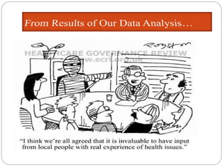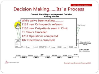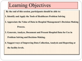 The document outlines a training session for healthcare professionals focused on data-driven problem solving and decision-making in hospital management. Participants will learn to identify healthcare challenges, apply various tools for problem solving, and enhance data collection and analysis to improve hospital outcomes. Key topics include the stages of problem solving, roles in decision-making, and the importance of data quality in supporting effective decisions.