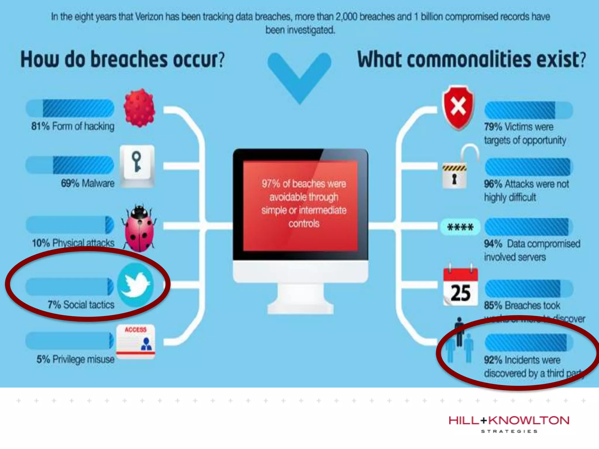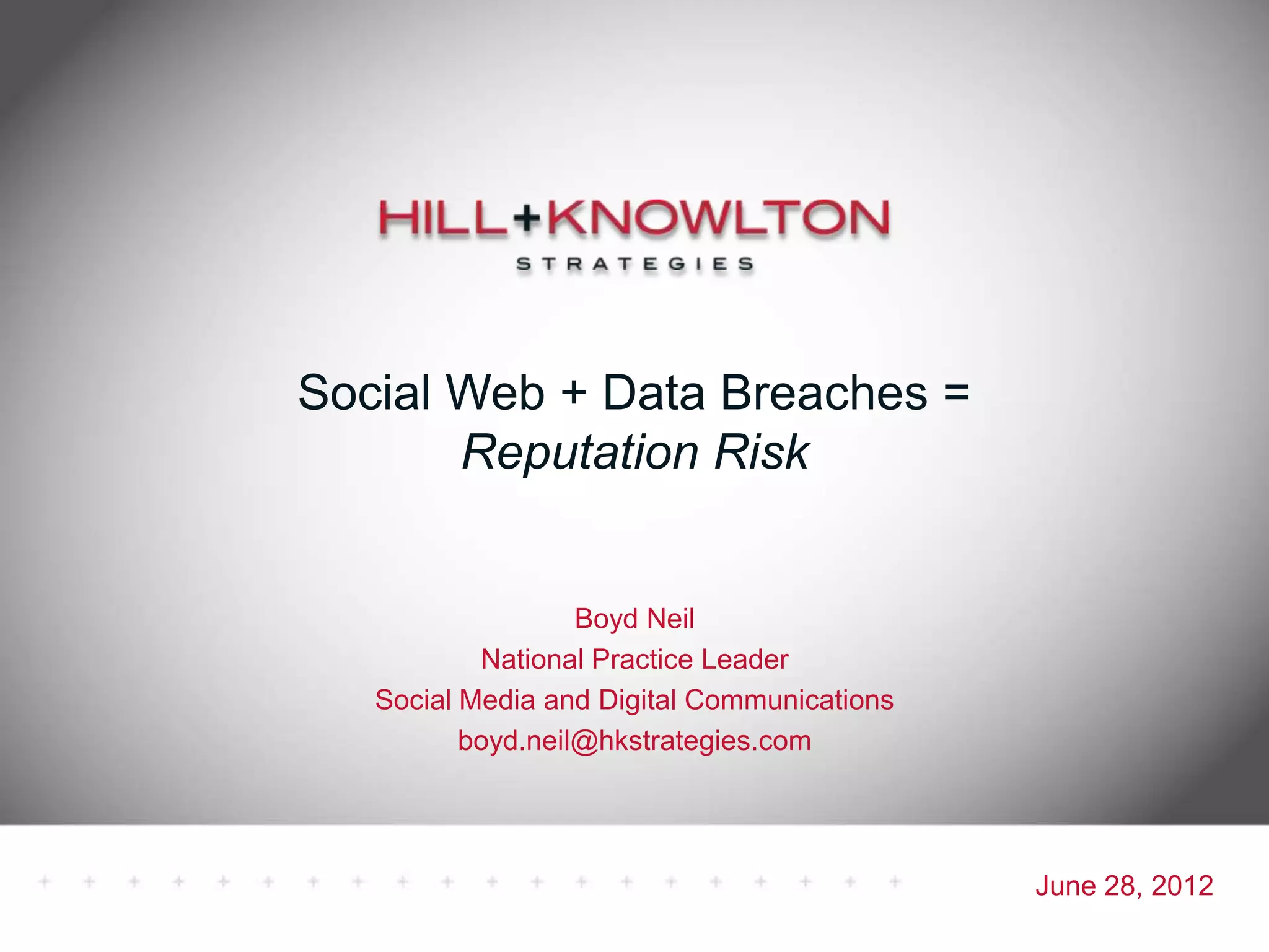 Social media and data breaches are intrinsically linked, as any significant event now will involve public participation online. When data breaches occur, organizations must communicate on social media in a timely, transparent manner to inform affected users and address questions with humility. An 11-point plan outlines best practices for multi-platform social media communication during a data breach, including driving internal notification, being transparent about impacts, coordinating protocols, engaging with online discussions, and committing to security improvements.