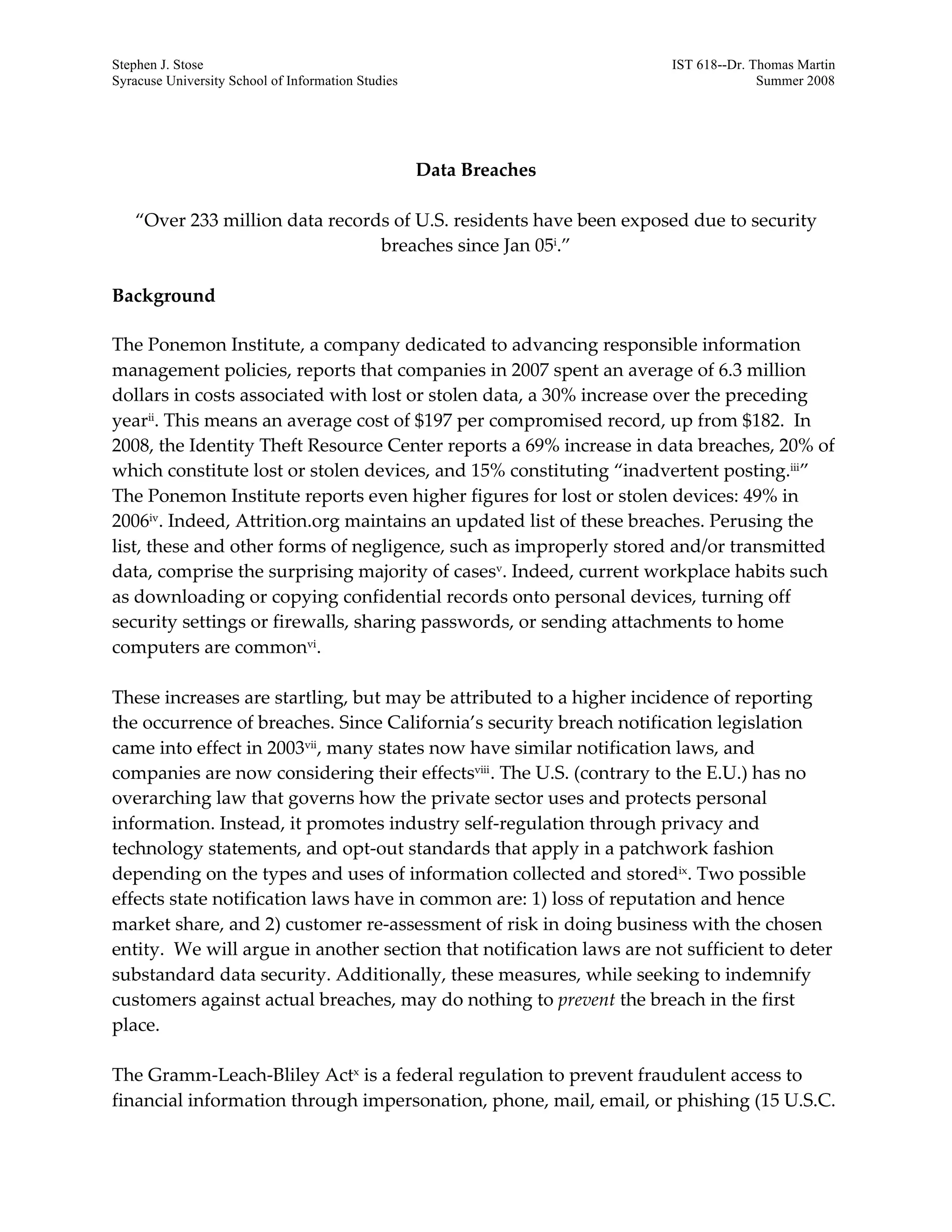 This document summarizes a paper about increasing data breaches and the need for legislation to address the problem. It notes that over 233 million US records have been exposed due to breaches since 2005. The document discusses the costs of breaches to companies and common causes, such as lost or stolen devices. It argues that while some states have breach notification laws, federal legislation is needed to standardize security practices and privacy protections across industries. The paper aims to examine if legislation is needed to reduce breaches, when people should be notified of breaches, and if compensation should be required.