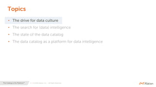 The document discusses the importance of data catalogs as platforms for data intelligence, emphasizing how they facilitate data culture, governance, and decision-making in organizations amidst the increasing complexity and volume of data. It highlights the evolution of data management, the need for effective collaboration, and the role of insights-driven businesses in achieving competitive advantage. Additionally, it outlines the benefits and imperatives of developing a robust data culture to maximize business growth and compliance.