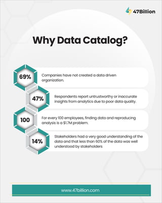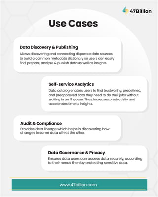 Why is there a need to wander the aisles to find the data in place when you have a Data Catalog to streamline data discovery across all data sources? Data catalogs have evolved to deliver governance capabilities like managing data quality and data privacy and compliance. It uses metadata and data management tools to organize all data assets within your organization. It helps synthesize the information across your data ecosystem – from data lakes, data warehouses, and other data repositories to empower authorized users to search for and access business-ready data for projects. Therefore, gain transparency into your most valuable data to drive new insights. Download use cases- https://47billion.com/big-data-analytics/
