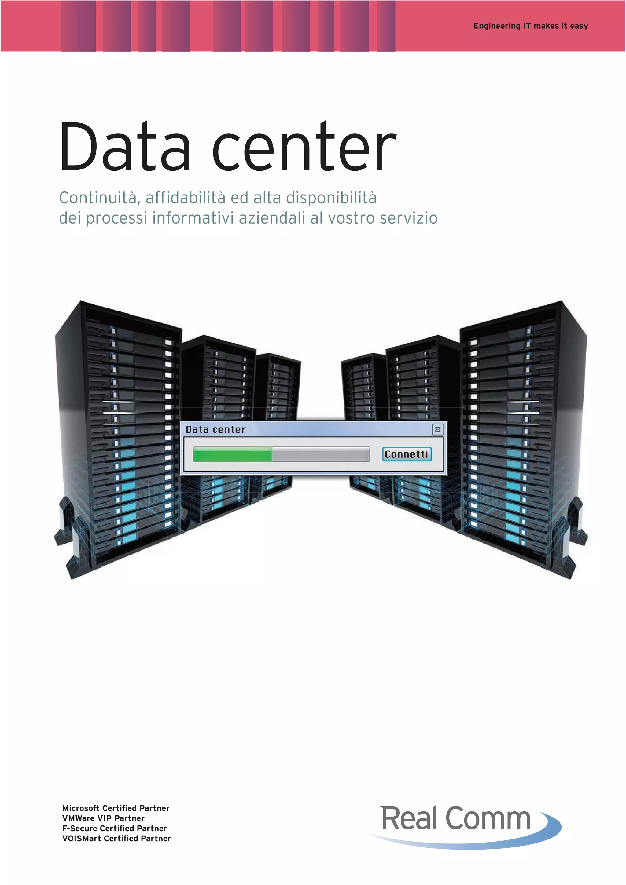 Il documento discute l'importanza dei data center per le aziende, sottolineando la necessità di garantire continuità, affidabilità e alta disponibilità per le applicazioni vitali. Si evidenzia l'innovazione nella gestione dei sottosistemi di alimentazione e raffreddamento, che tramite un management intelligente possono ridurre il consumo energetico fino al 40%, contribuendo così alla creazione di data center green. Inoltre, vengono elencate le caratteristiche principali, come la connettività ridondante in fibra ottica, la scalabilità e l'integrazione con tecnologie come cloud computing e virtualizzazione.