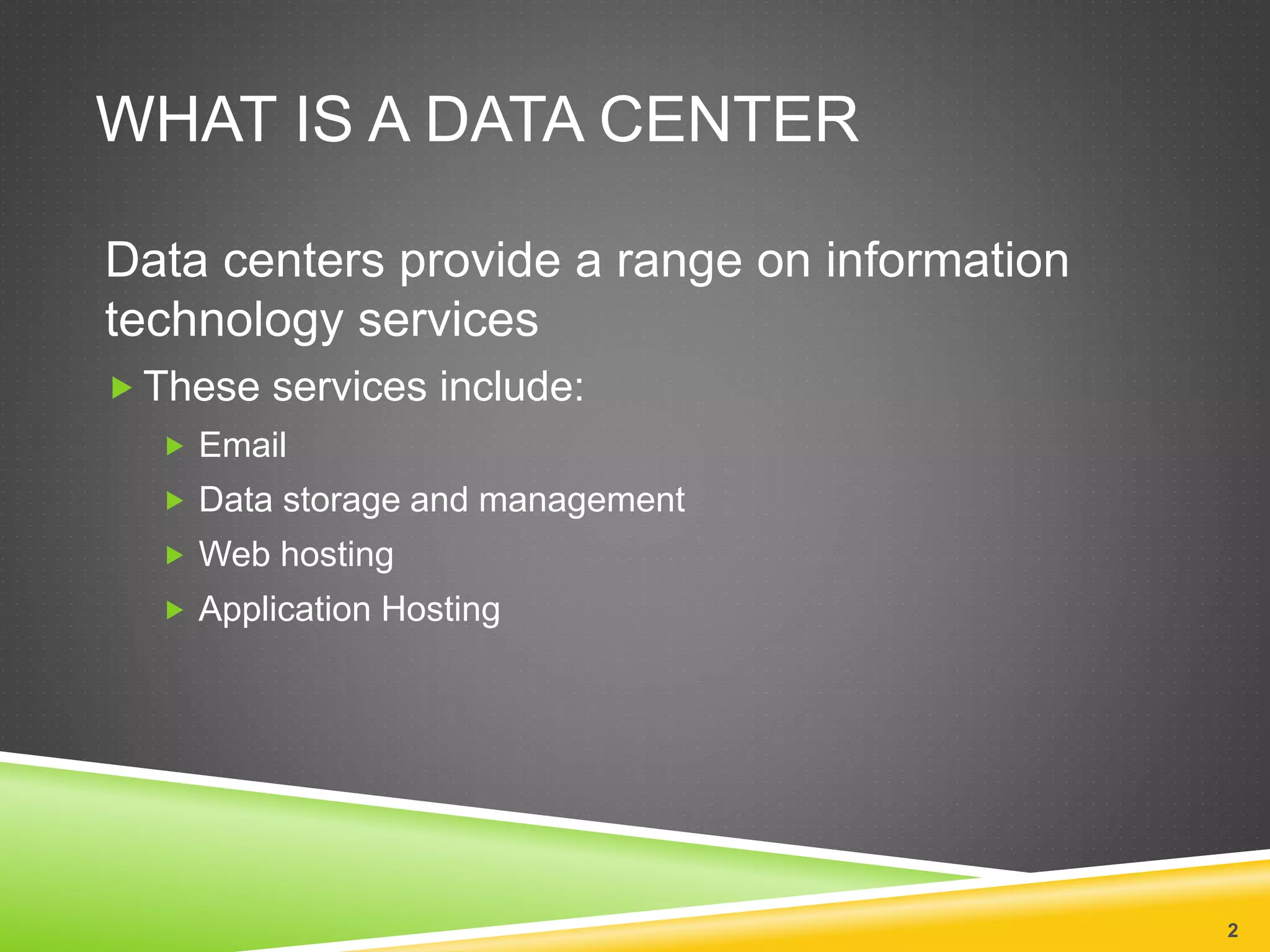 This document provides an overview of data centers, including what they are, their components, benefits, and classifications. A data center houses servers and networking equipment to provide services like email, data storage, and web hosting. It discusses components like cooling, UPS, PDU, and backup power needed to support IT equipment. Data centers are classified based on their redundancy and availability, with tier 1 being the least redundant and tier 4 being the most fault tolerant.