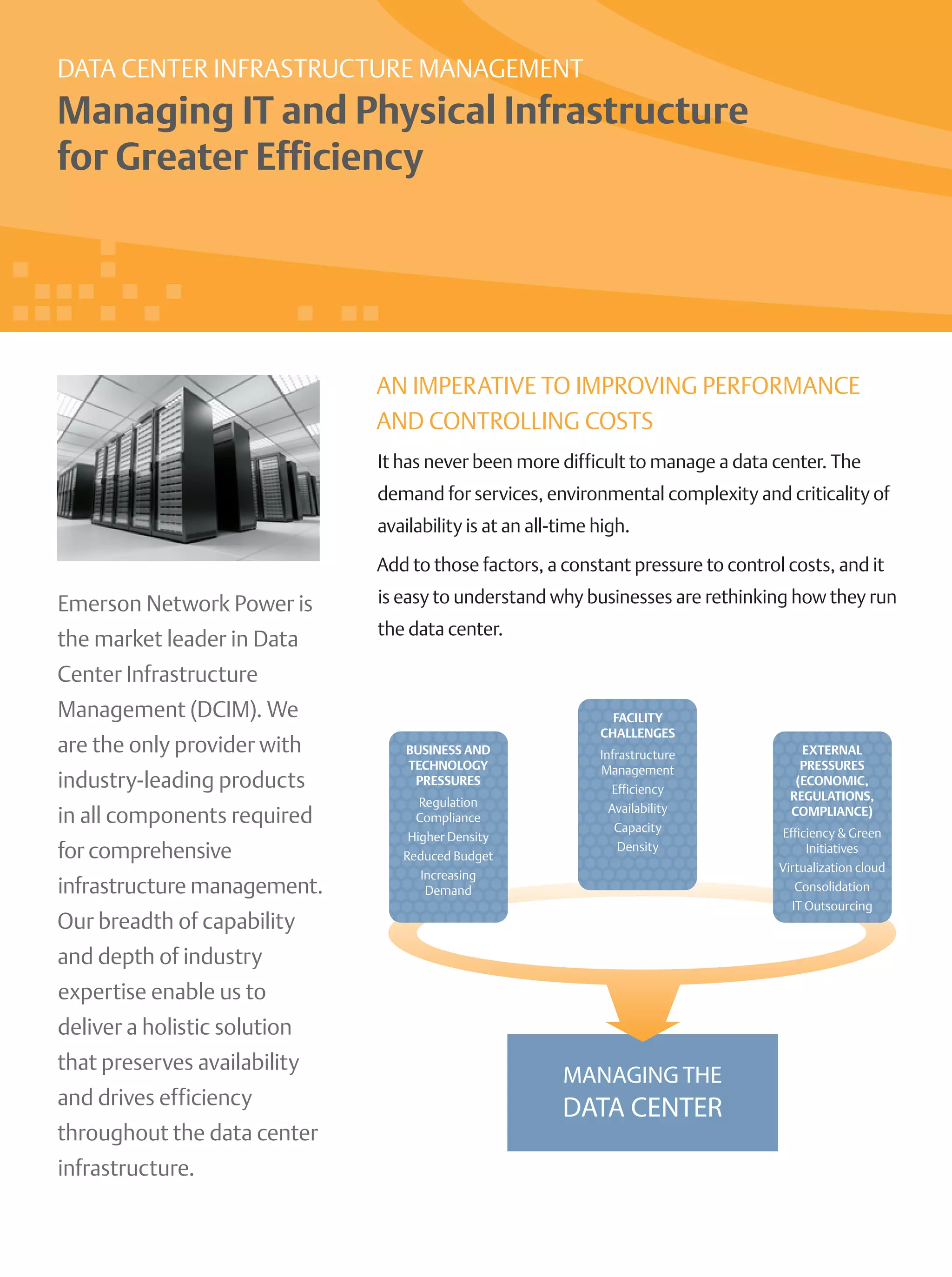 A data center infrastructure management (DCIM) system collects and manages information about a data center's assets, resource use, and operational status. This information is analyzed and distributed to help optimize the data center's performance and meet business goals. Implementing DCIM solutions such as instrumentation, monitoring, and analytics can improve efficiency, reduce costs, and enable proactive management of the physical infrastructure and IT systems. Emerson Network Power provides a comprehensive portfolio of DCIM hardware and software products to help organizations gain visibility and control over their data center resources.