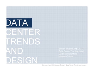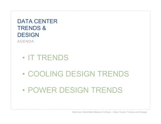 The document discusses current trends in data center design, focusing on IT trends such as virtualization, increasing load density, and cooling design approaches. It highlights the significance of maintaining reliability in power systems while addressing challenges posed by rising temperatures and equipment density. Additionally, it outlines various cooling system alternatives and the importance of redundancy in power configurations to ensure continuous operation.