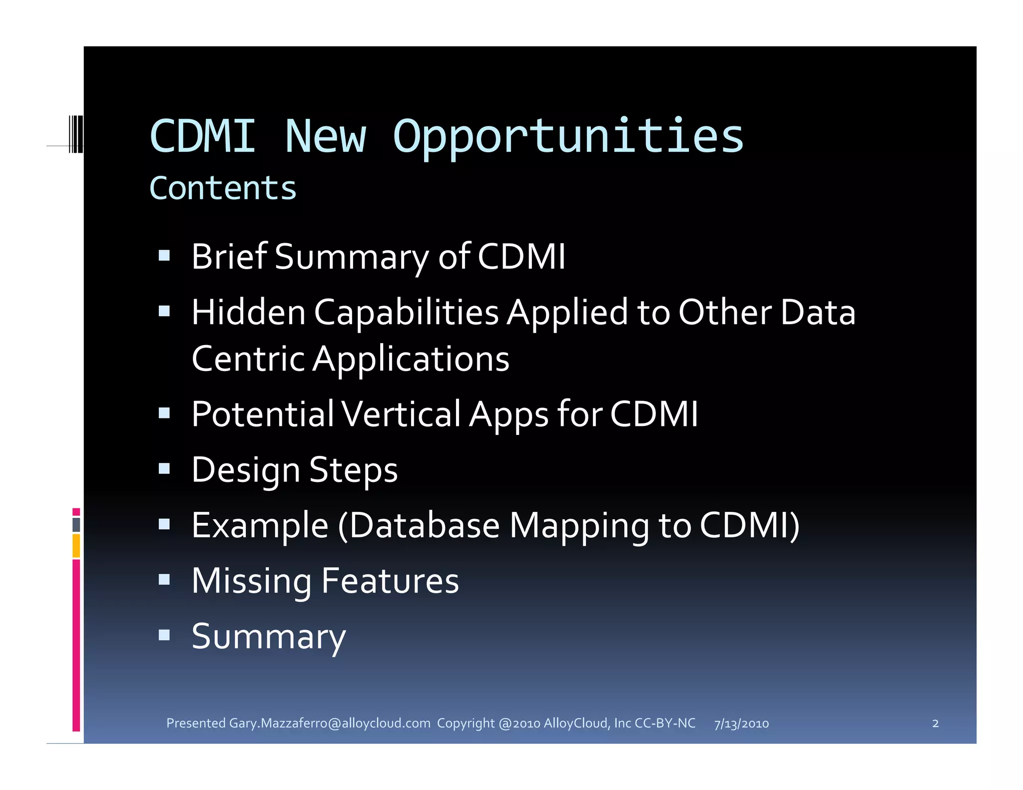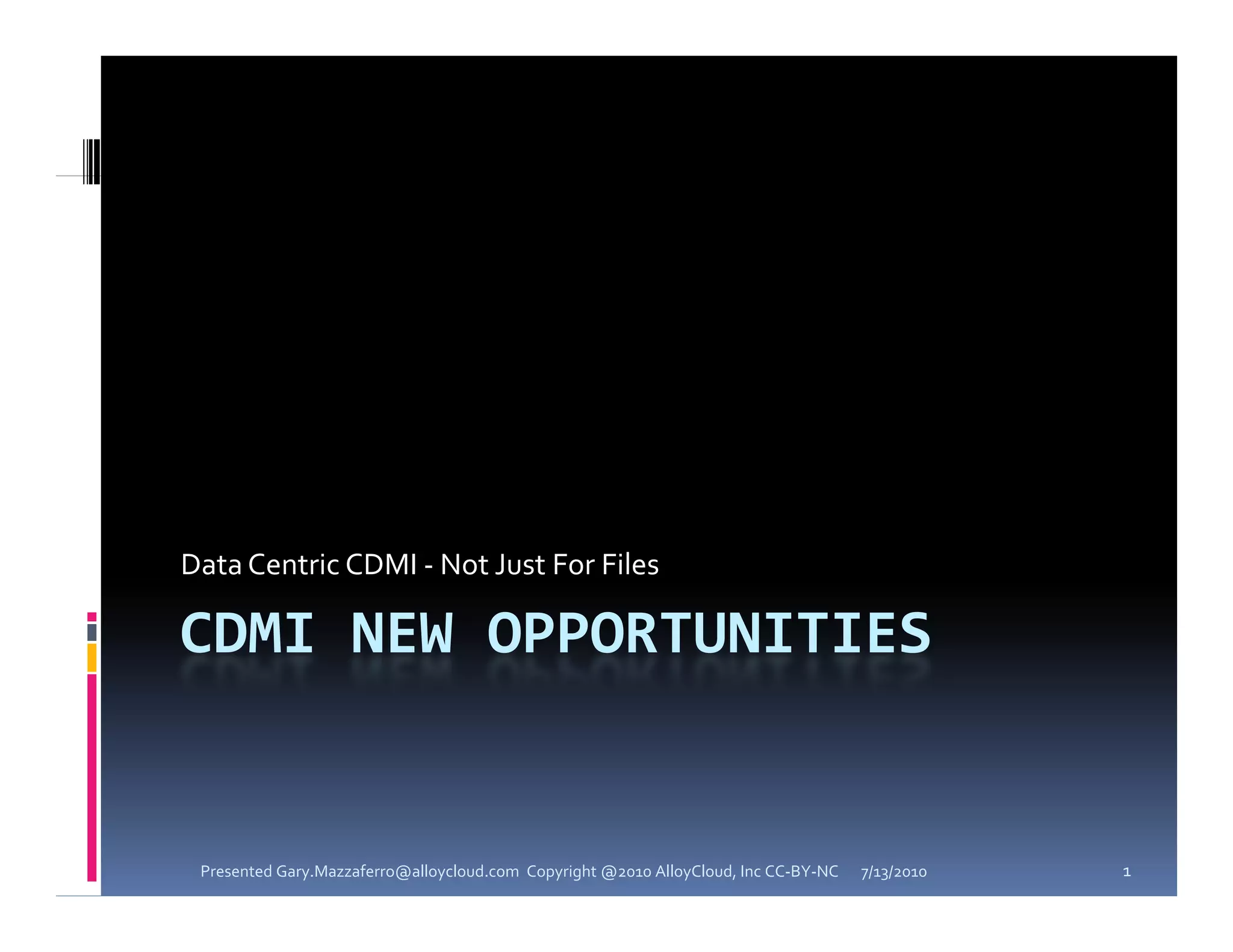 The document discusses using the Cloud Data Management Interface (CDMI) for more than just file storage. It outlines how CDMI capabilities like its RESTful interface and use of JSON could enable it to support a variety of data-driven applications beyond files. Examples mentioned include databases, calendars, email, documents, wikis, and sensor data. The document also describes how CDMI could provide a common data management approach across cloud applications and potentially serve as a document interface for cloud computing. It notes some missing CDMI features and concludes that CDMI is a flexible technology capable of supporting many types of data applications.