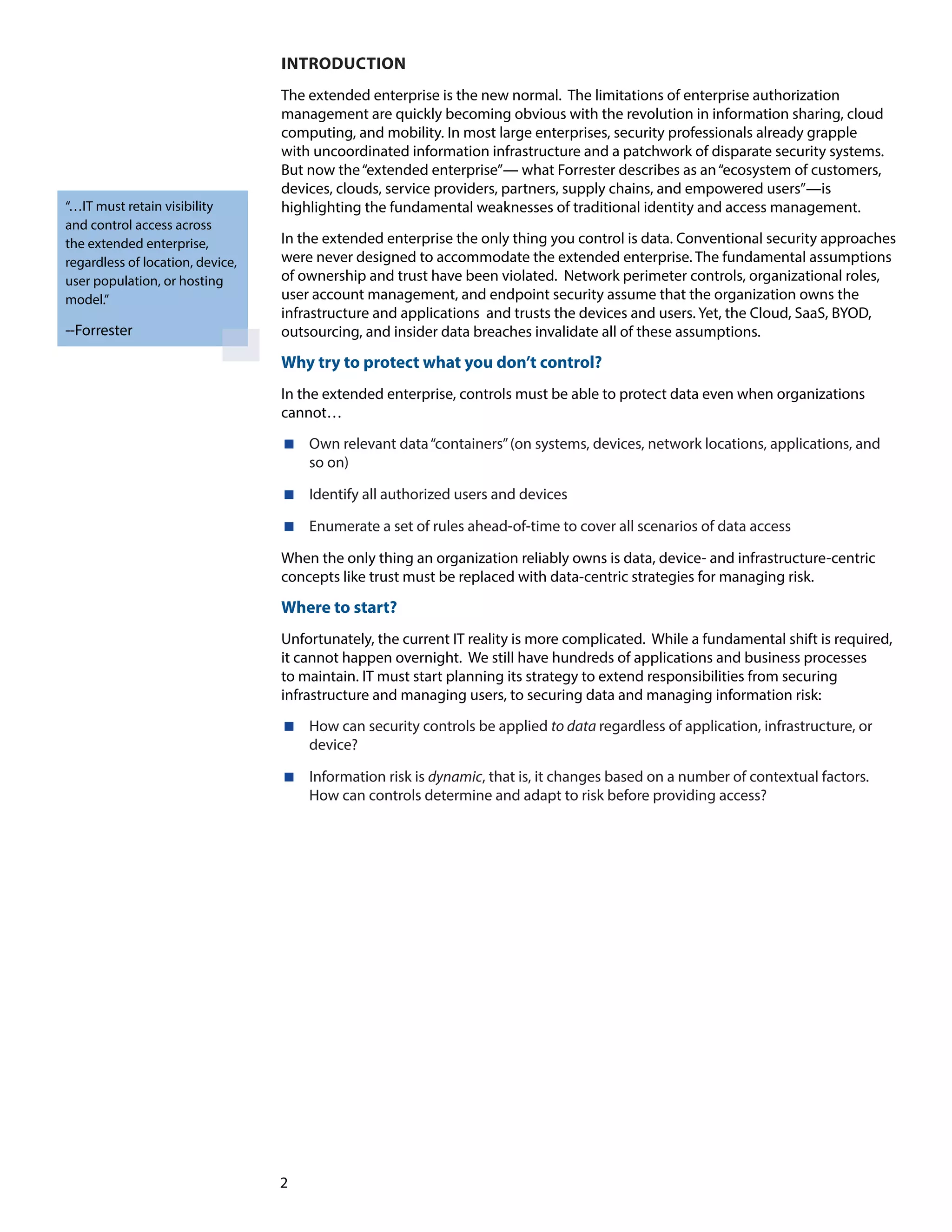 This white paper discusses the necessity for organizations to shift towards data-centric security to protect sensitive information in the evolving landscape of the extended enterprise. It outlines four fundamental changes needed to implement this approach, emphasizing the limitations of traditional security measures and the benefits of attribute-based access control (ABAC). Additionally, the paper highlights the challenges organizations face in adopting ABAC and the importance of dynamic risk management.