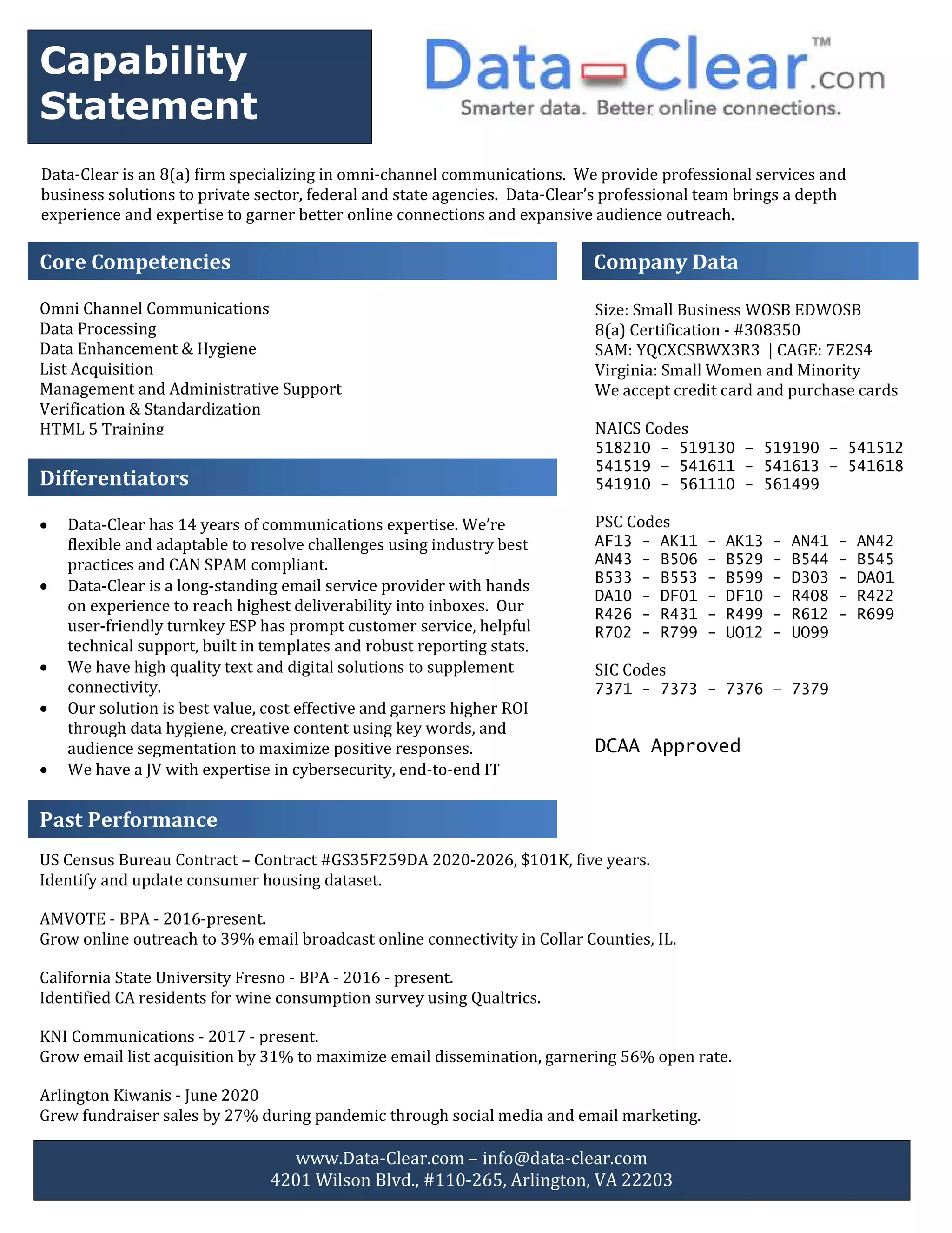 Data-Clear is a small, woman-owned business that specializes in omni-channel communications, data processing, and list acquisition. With 14 years of experience, they are flexible and compliant with industry best practices. Their user-friendly email service provider has high deliverability rates and helpful support. Data-Clear offers cost-effective text and digital solutions to maximize audience outreach and positive responses through data hygiene and creative content. They also have expertise in cybersecurity and IT solutions to supplement connectivity.