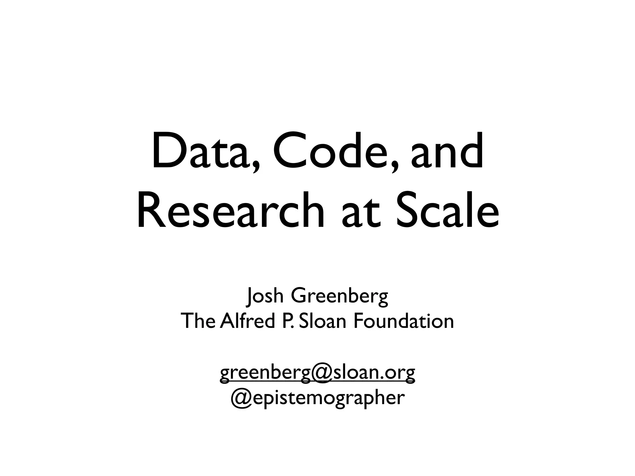 The document discusses the opportunities for research at scale enabled by new technologies for data, code, and digital scholarship. It notes that these technologies allow data and research to be conducted, shared, and built upon at a much larger scale than previously possible. However, current modes of scholarly publication and evaluation are not fully aligned with these new collaborative and iterative research methods. The document advocates for exploring new forms of open scholarship that better support reproducible, transparent and collaborative work at large scale across disciplines.