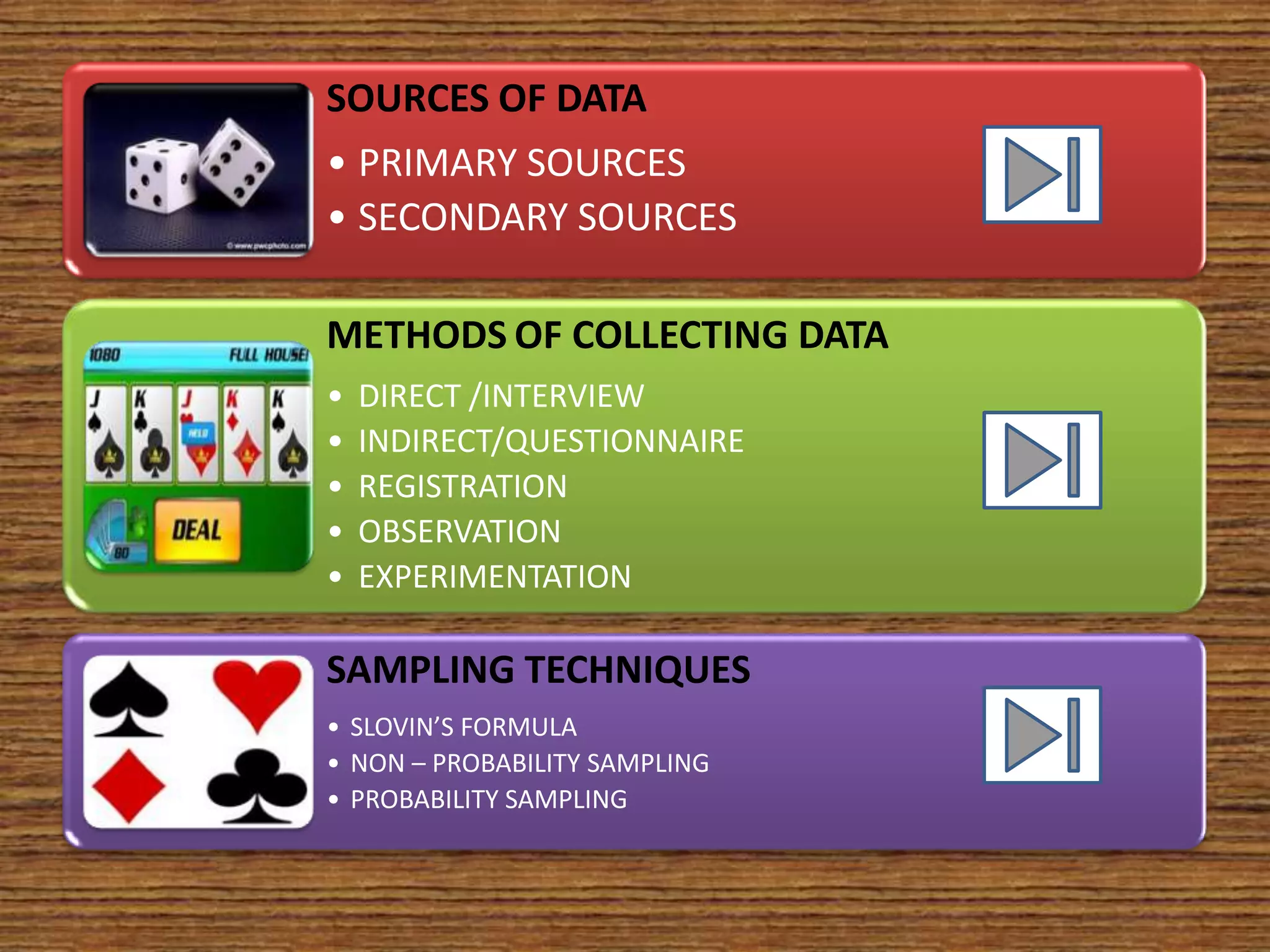 This document discusses research methods, including sources of data, methods of collecting data, and sampling techniques. It describes primary and secondary sources of data, as well as direct/interview, indirect/questionnaire, registration, observation, and experimentation as methods of collecting data. The document also explains probability sampling techniques like simple random sampling, systematic random sampling, stratified random sampling, and cluster sampling. It provides Slovin's formula for determining sample size and discusses margin of error. Non-probability sampling techniques such as convenience, quota, and purposive sampling are also outlined.