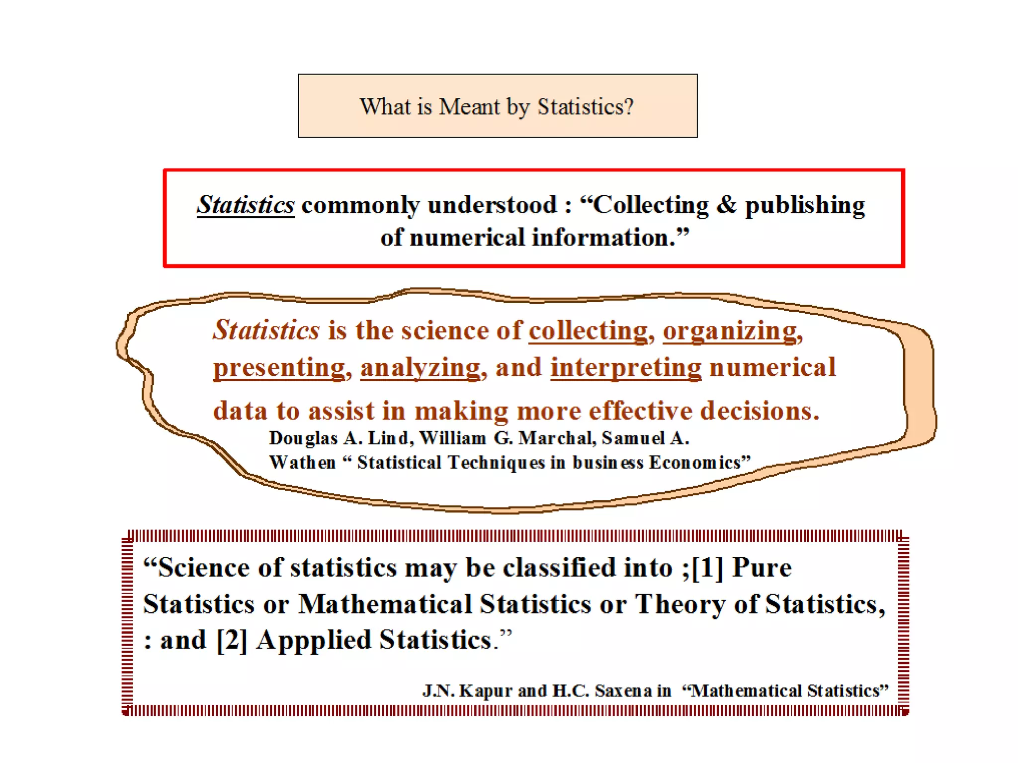 1. The document defines statistics as the scientific method of collecting, organizing, presenting, analyzing and interpreting numerical information to assist in decision making.